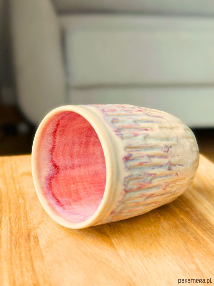 Wnętrze kubka zaskakuje intensywną, nasyconą barwą przywodzącą na myśl malinowy sorbet. Kolor nie jest jednolity – miękkie przejścia tonalne od jaśniejszych, pudrowych różów po głębsze, owocowe czerwienie układają się w naturalne, nieregularne smugi, podkreślając rękodzielniczy charakter przedmiotu.