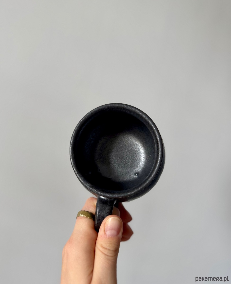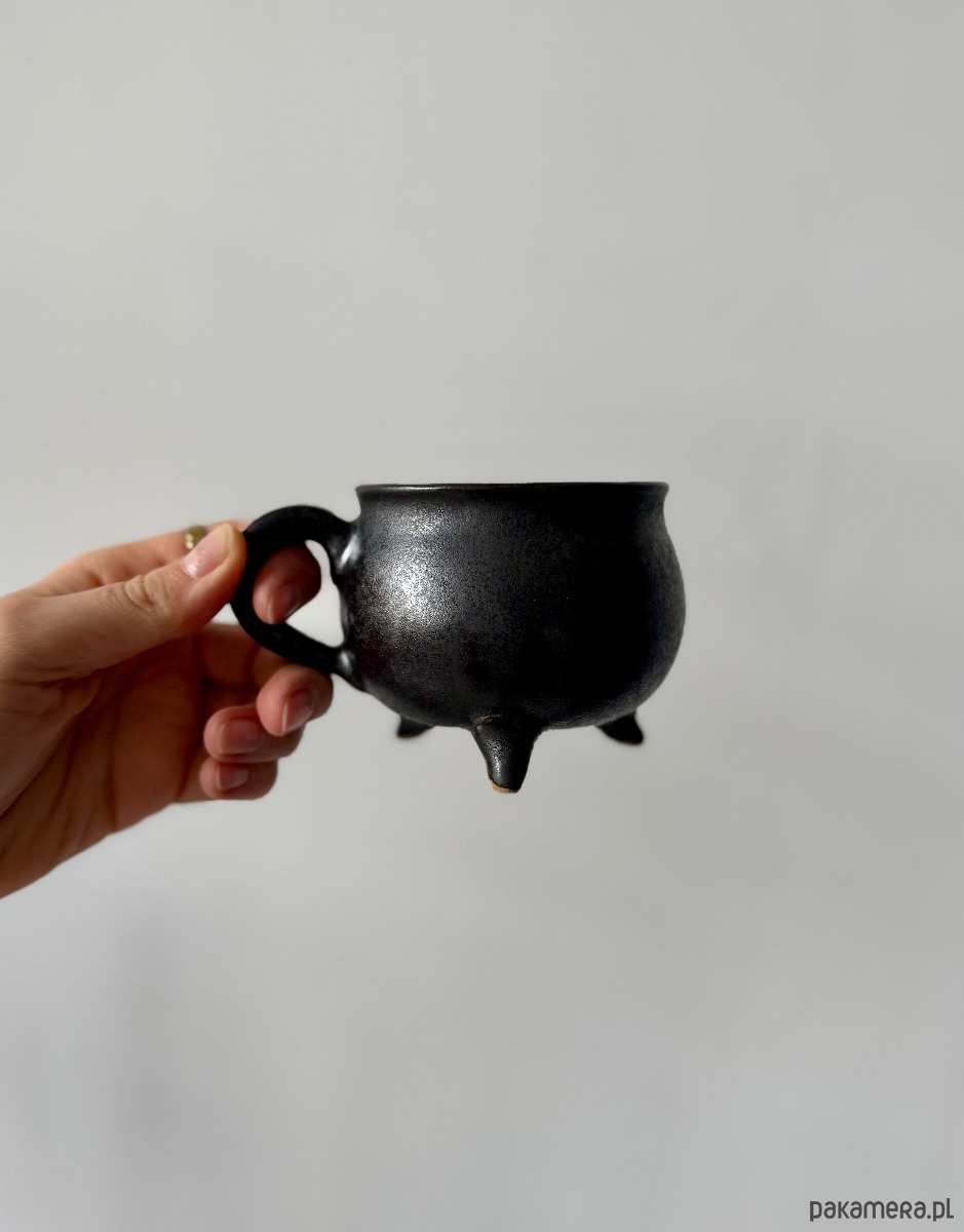 Kamionkowy kubek o uroczym kształcie kociołka idealny na gorącą czekoladę lub grzaniec. Naczynie zostało wytoczone na kole garncarskim, a następnie doklejono do niego nóżki i wygodny uchwyt. Pokryty został czarnym, satynowym szkliwem.