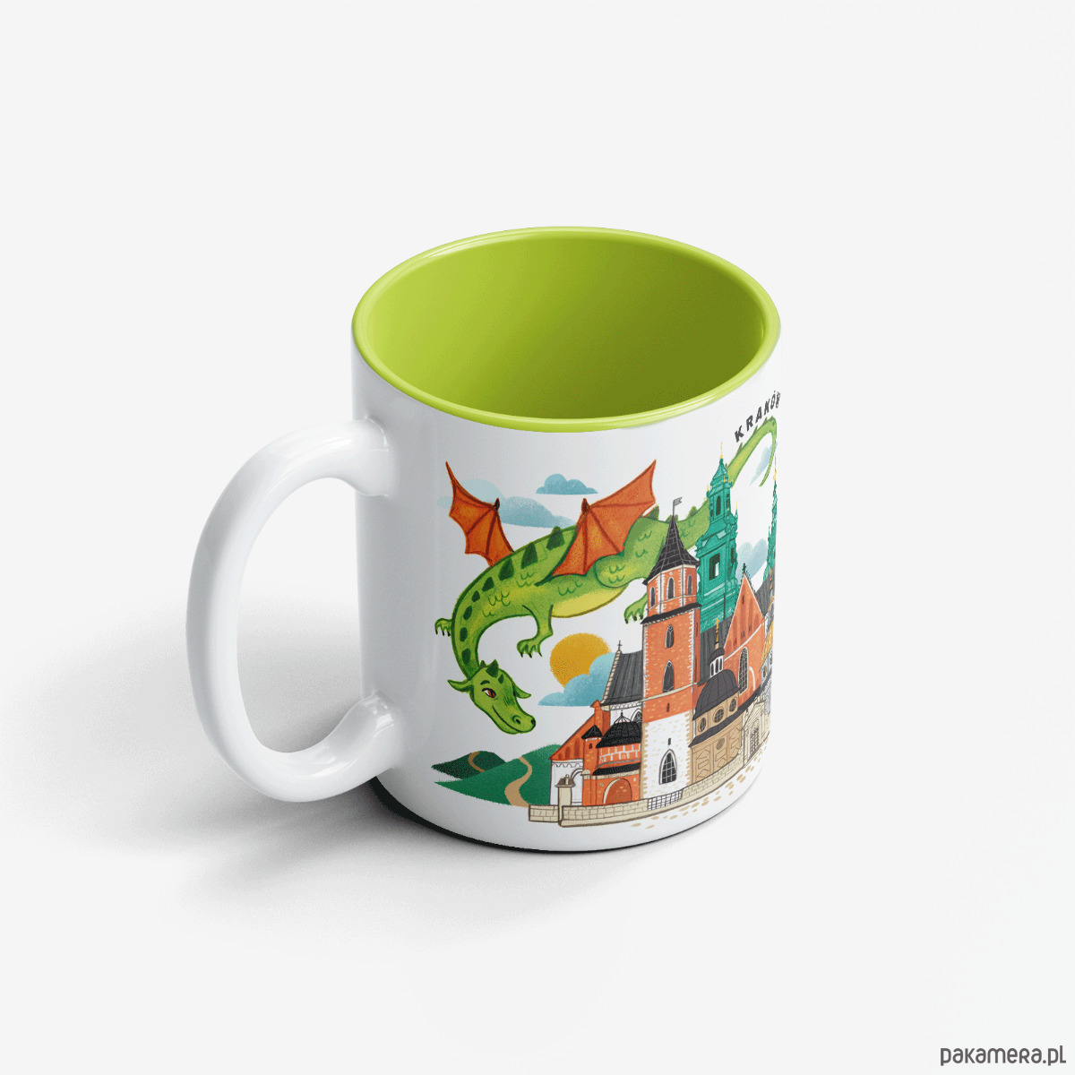 Kubek z zielonym środkiem z przepiękną panoramą Wawelu i lecącym nad nim smokiem.
