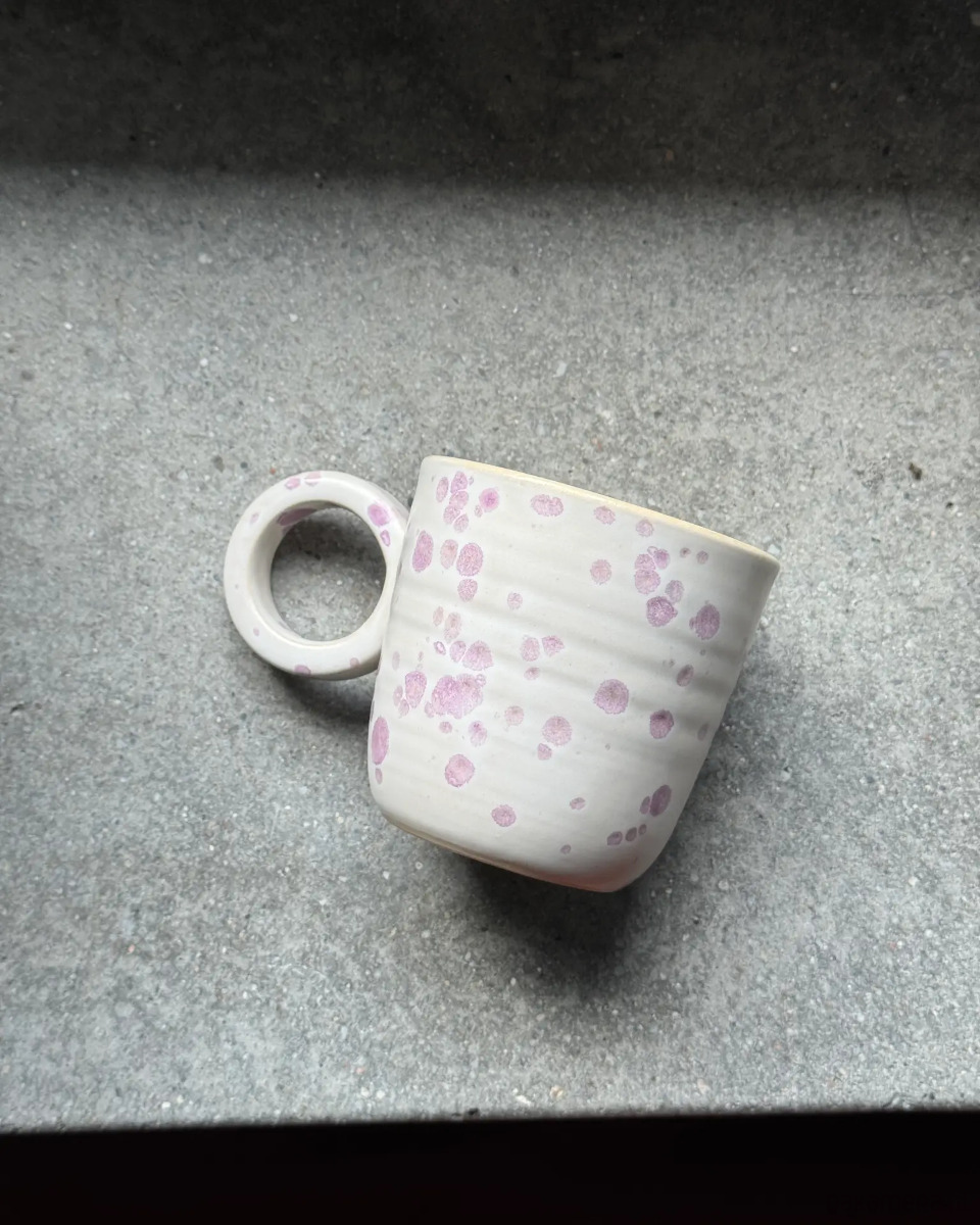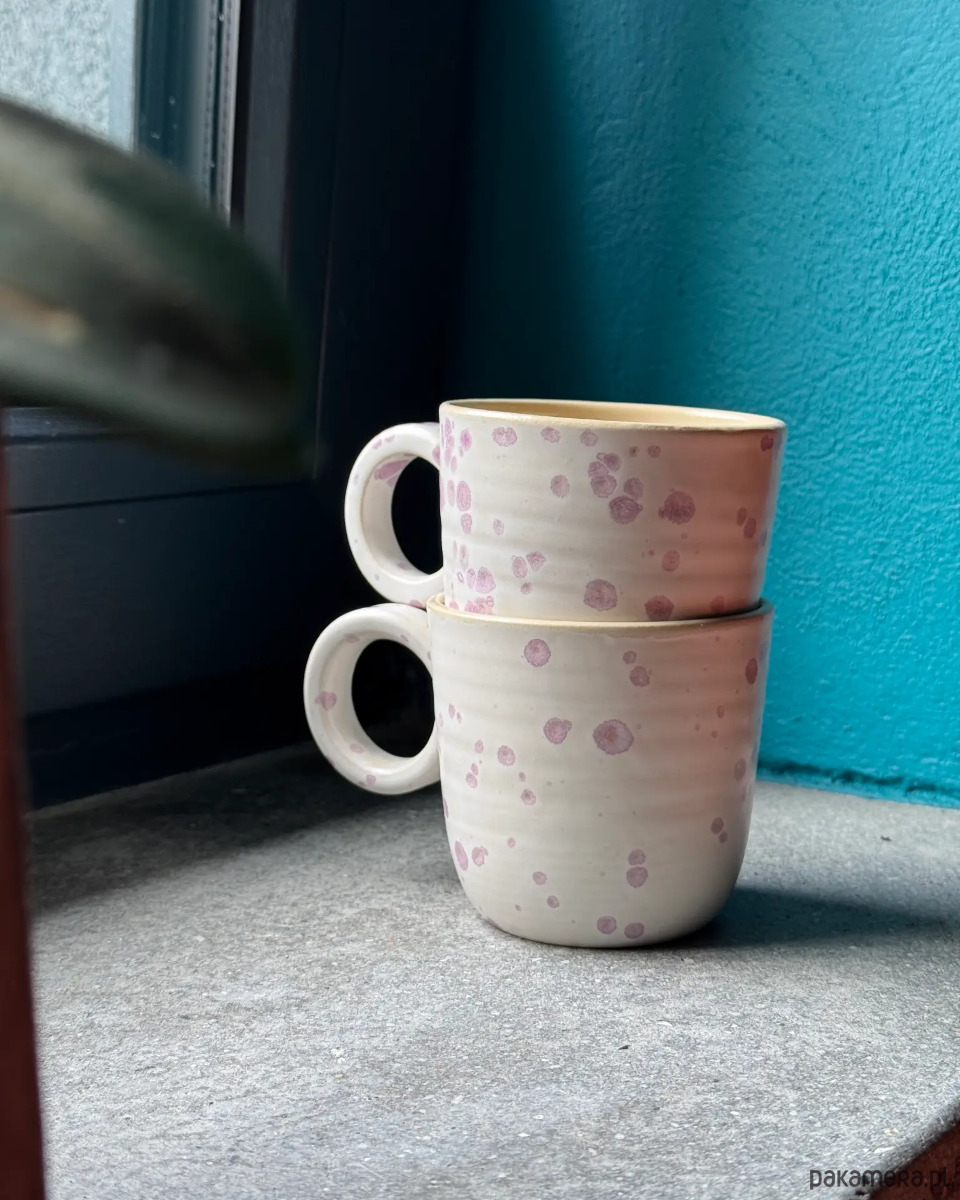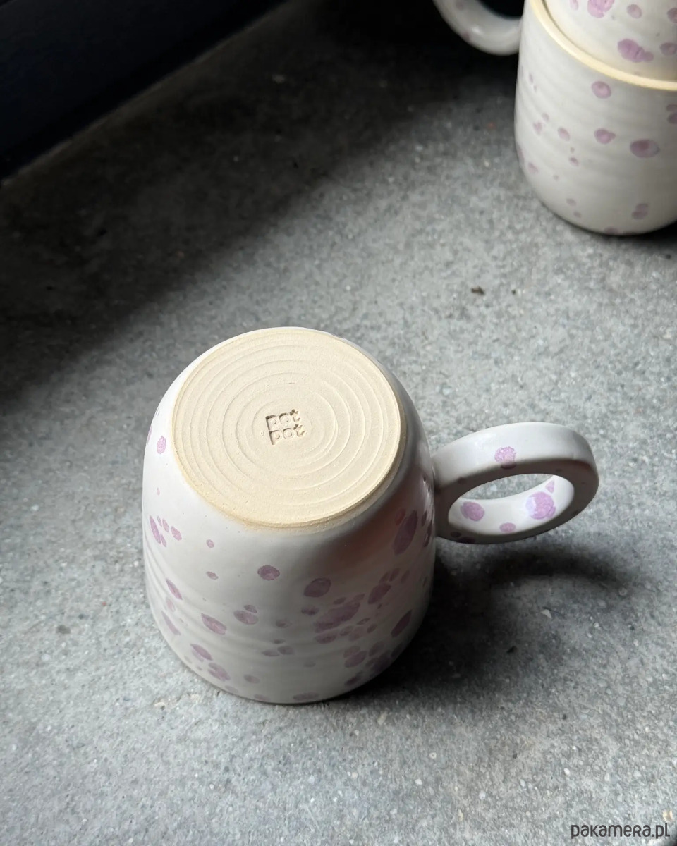Dekoracja: nieregularne, krystaliczne plamki w odcieniach delikatnego fioletu/lawendy, rozmieszczone na powierzchni kubka – nadają mu subtelny, naturalny efekt.