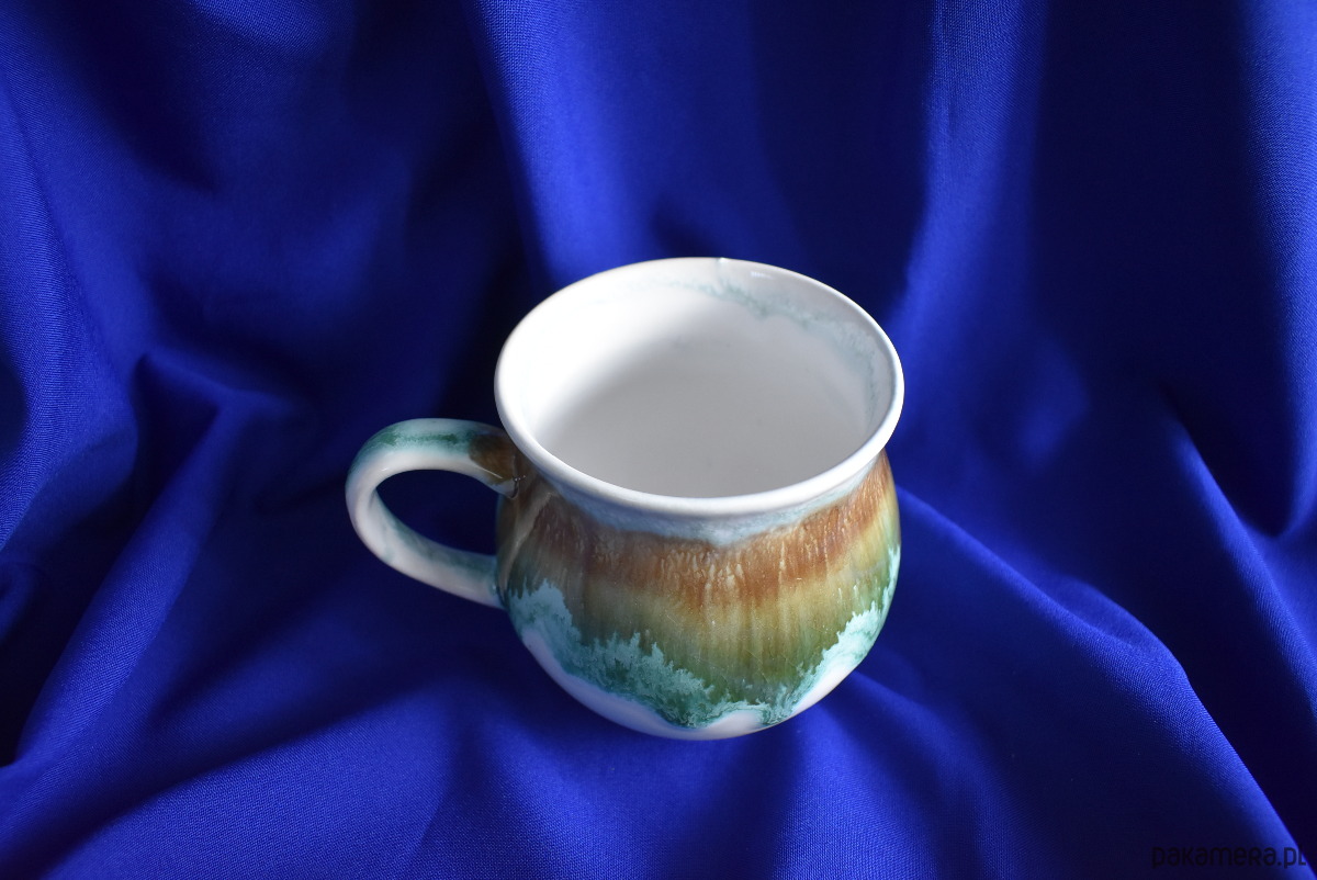 Ręcznie malowany kubek ceramiczny utrzymany w klasycznym zestawieniu bieli, oraz barw lasu. Przejścia między kolorami nadają mu unikalny charakter.