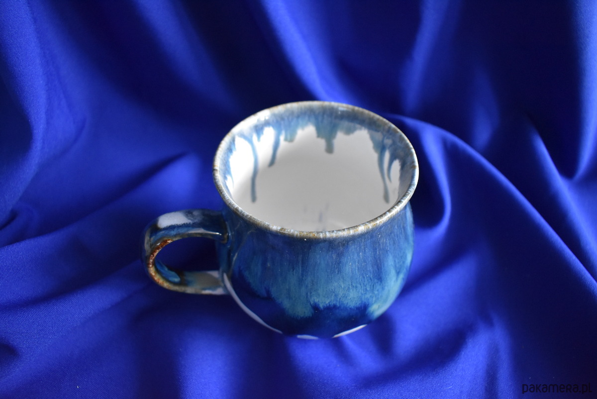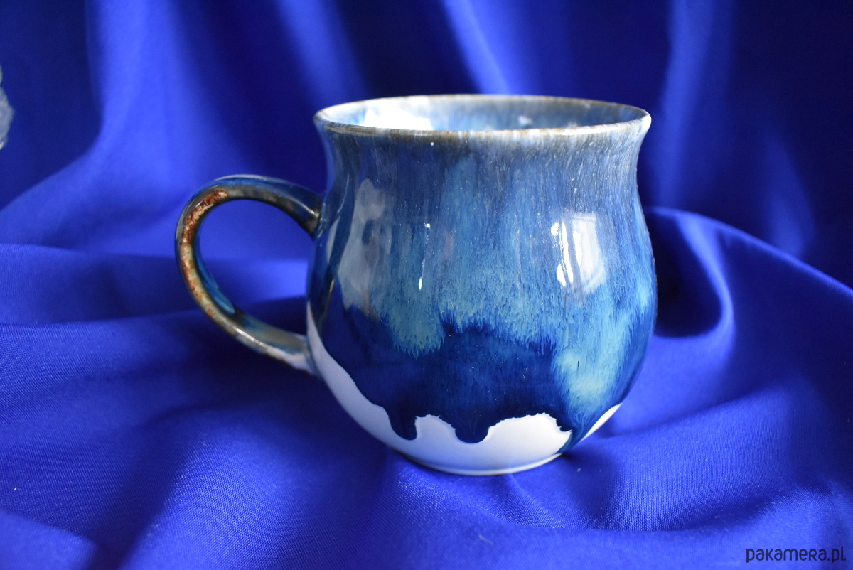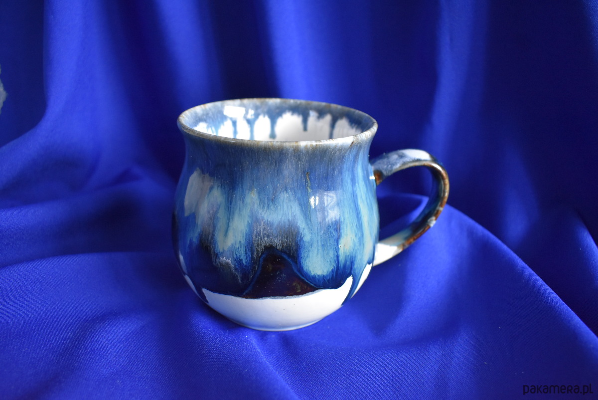 Ręcznie malowany kubek ceramiczny utrzymany w klasycznym zestawieniu bieli i morskiej głębi. Przejścia między kolorami nadają mu unikalny charakter.