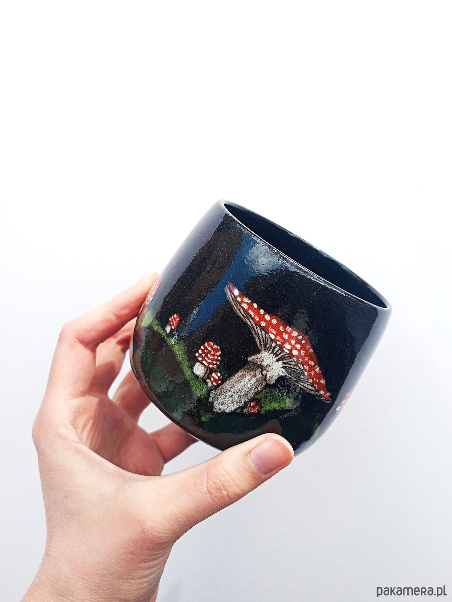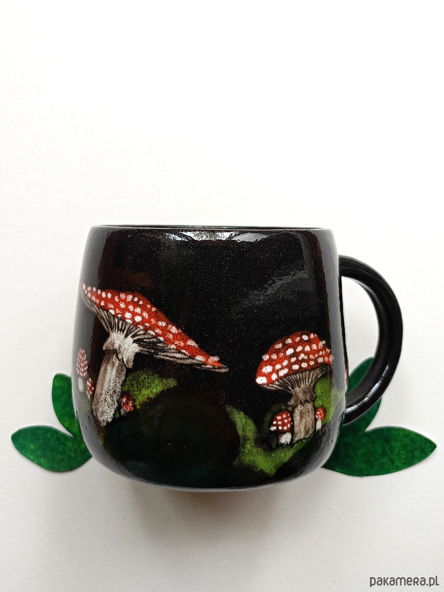 Kubek wykonany techniką toczenia na kole i malowany w muchomory. Idealny prezent dla grzybiarza, fana leśnych baśni i właściwie każdej pozytywnie zakręconej osoby :D