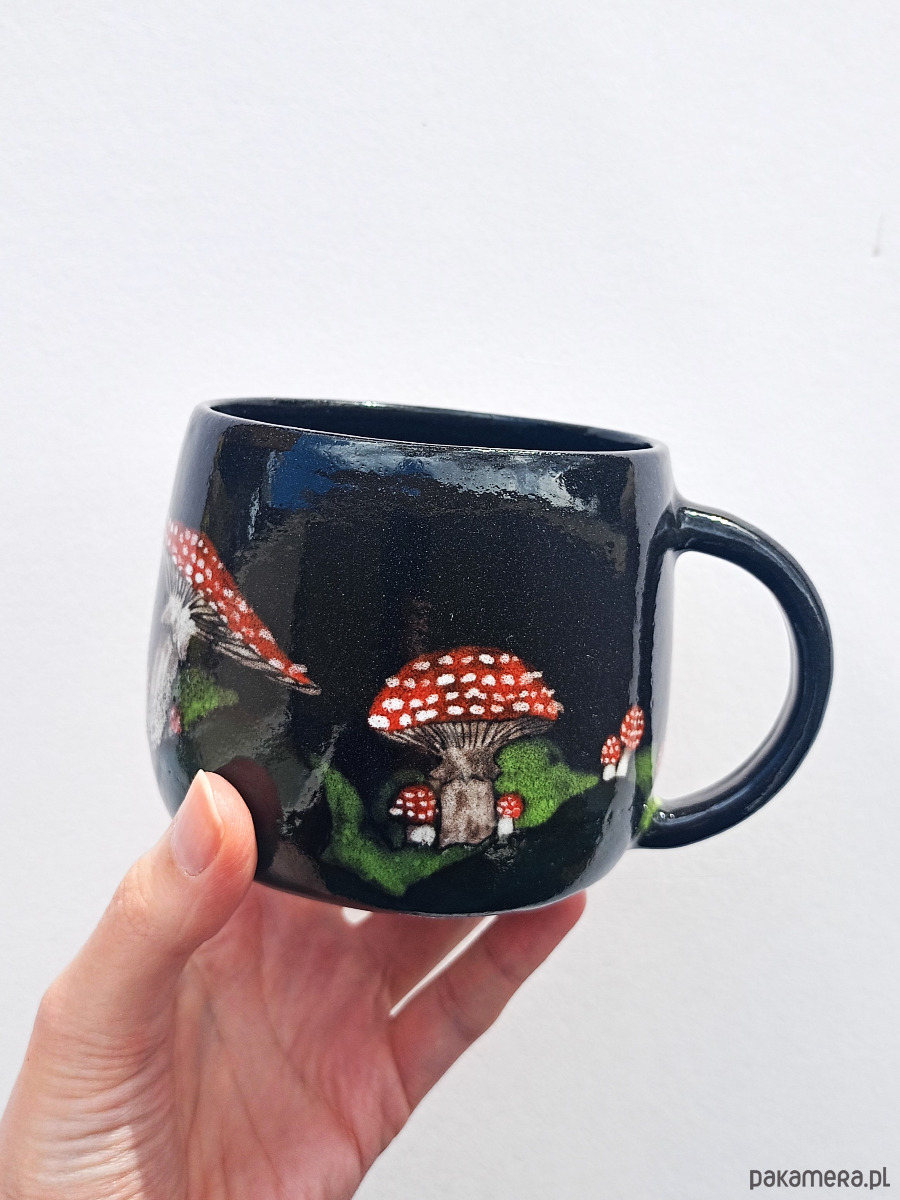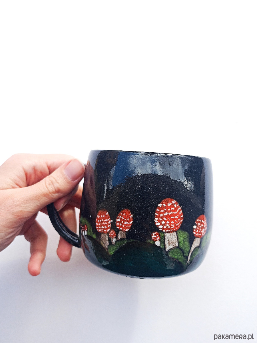 Niepowtarzalny, ceramiczny kubek w muchomorki, wykonany i zdobiony ręcznie.