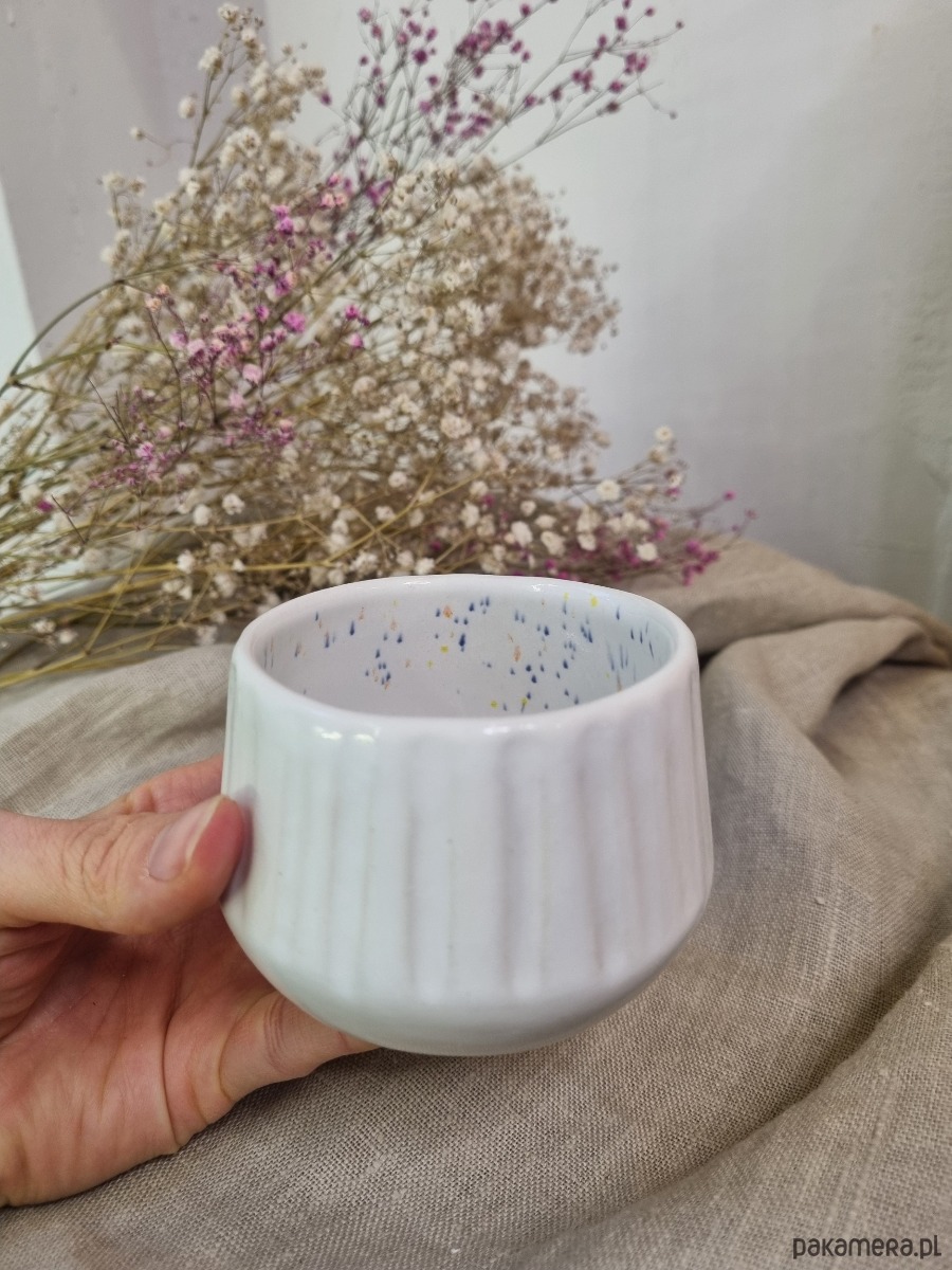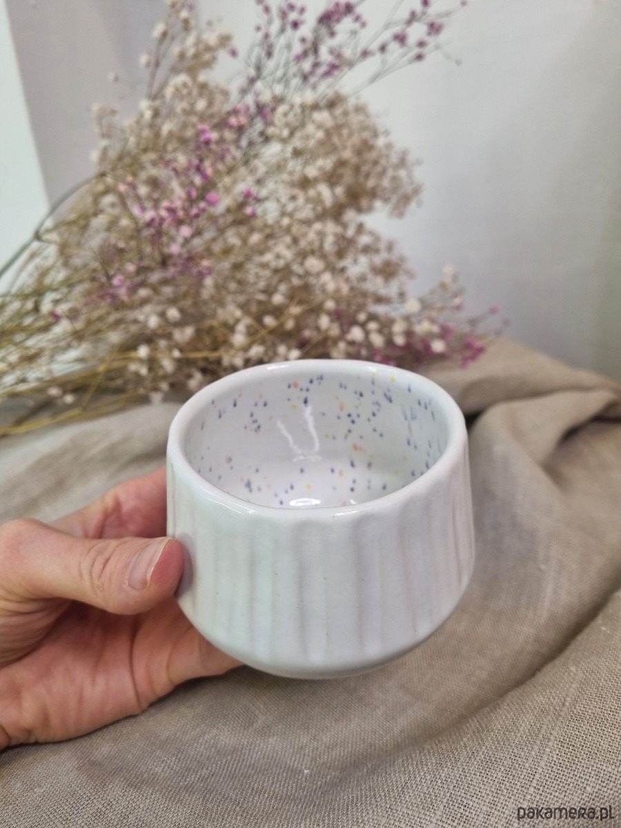 - Unikalny design: Czarka w kolorze bieli z subtelnymi kolorowymi kropkami wewnątrz naczynia, sprawia, że jest nie tylko piękna, ale i niepowtarzalna. Ręcznie rzeźbiona faktura zewnętrzna dodaje jej charakteru.