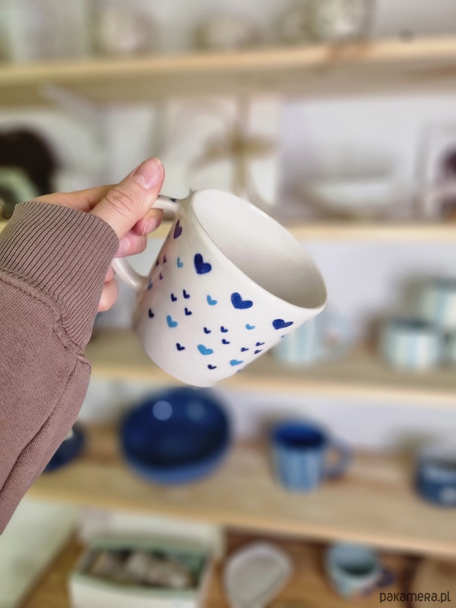 Wyobraź sobie poranek, kiedy siadasz z kubkiem w dłoni, a ciepło napoju otula Cię jak przytulenie. Ten ręcznie malowany kubek z serduszkami doda koloru i radości do Twojego dnia.