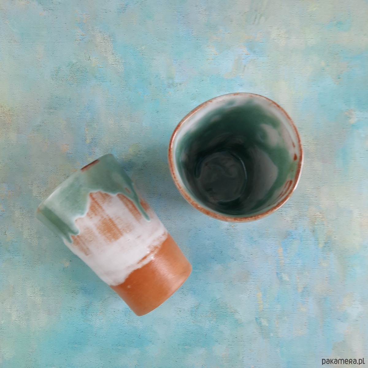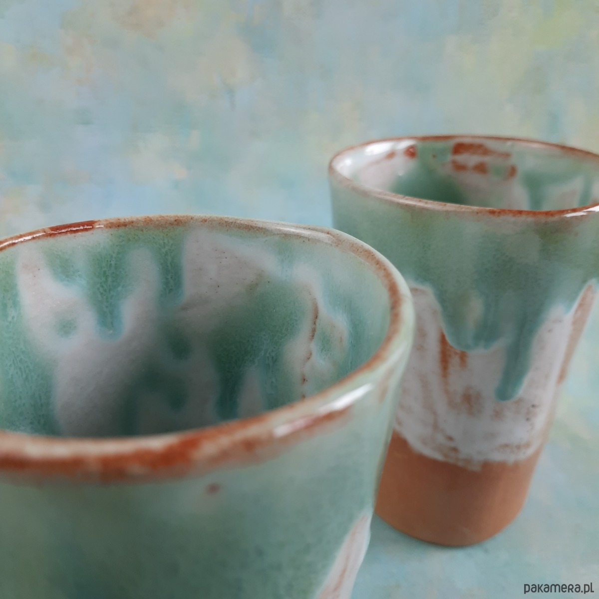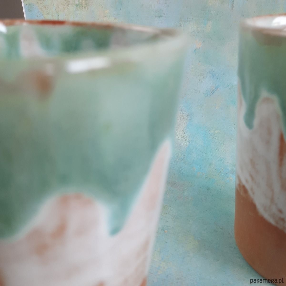 Efekt przypomina naturalne krajobrazy – ziemię, mgłę i krople wody. To połączenie kolorów nadaje kubkom spokojny, rzemieślniczy charakter.