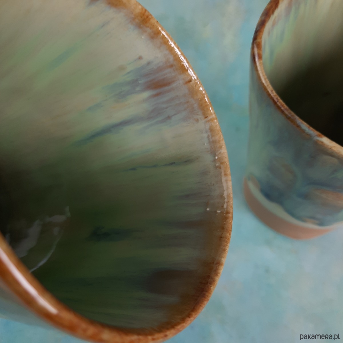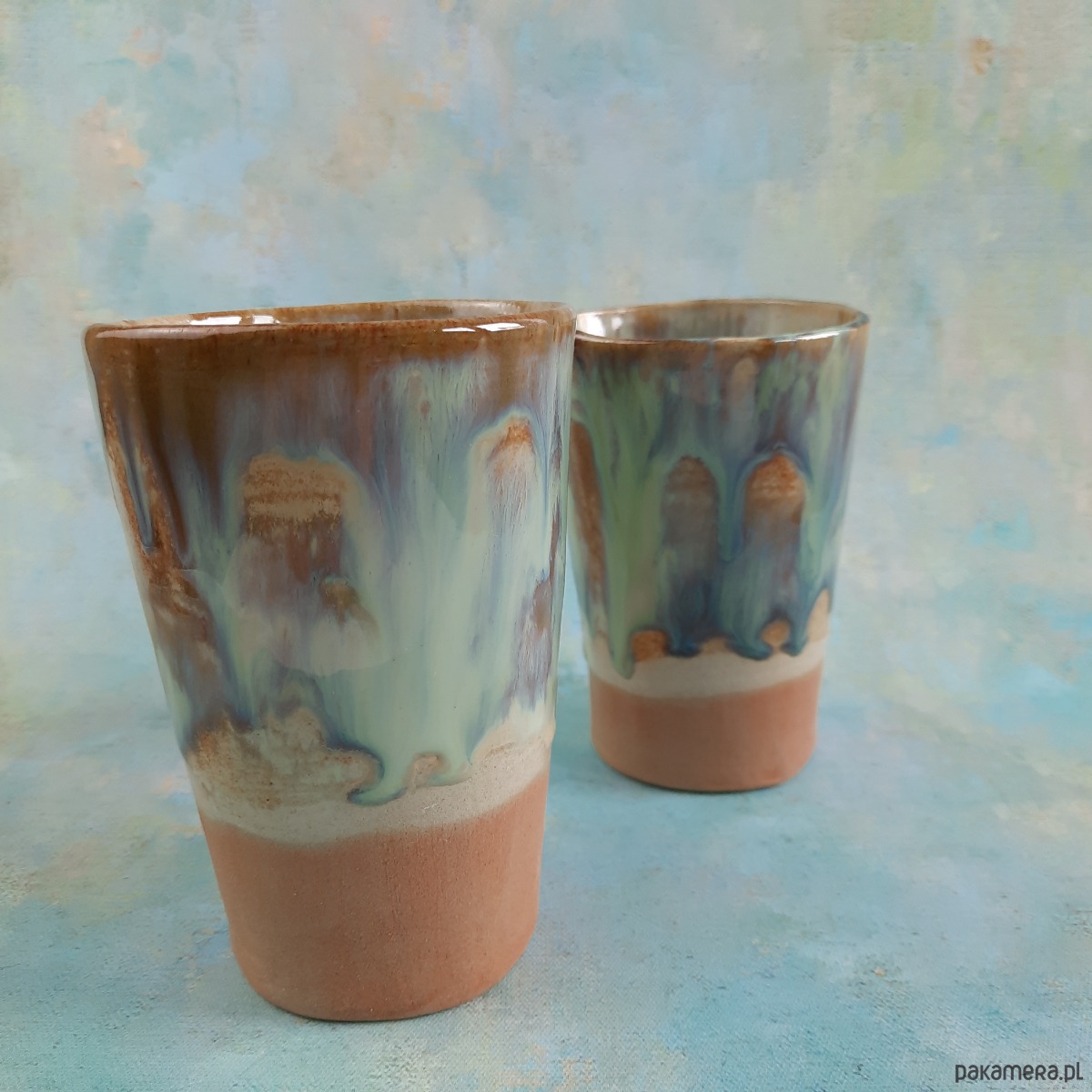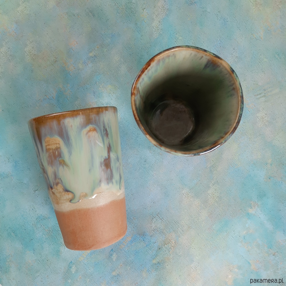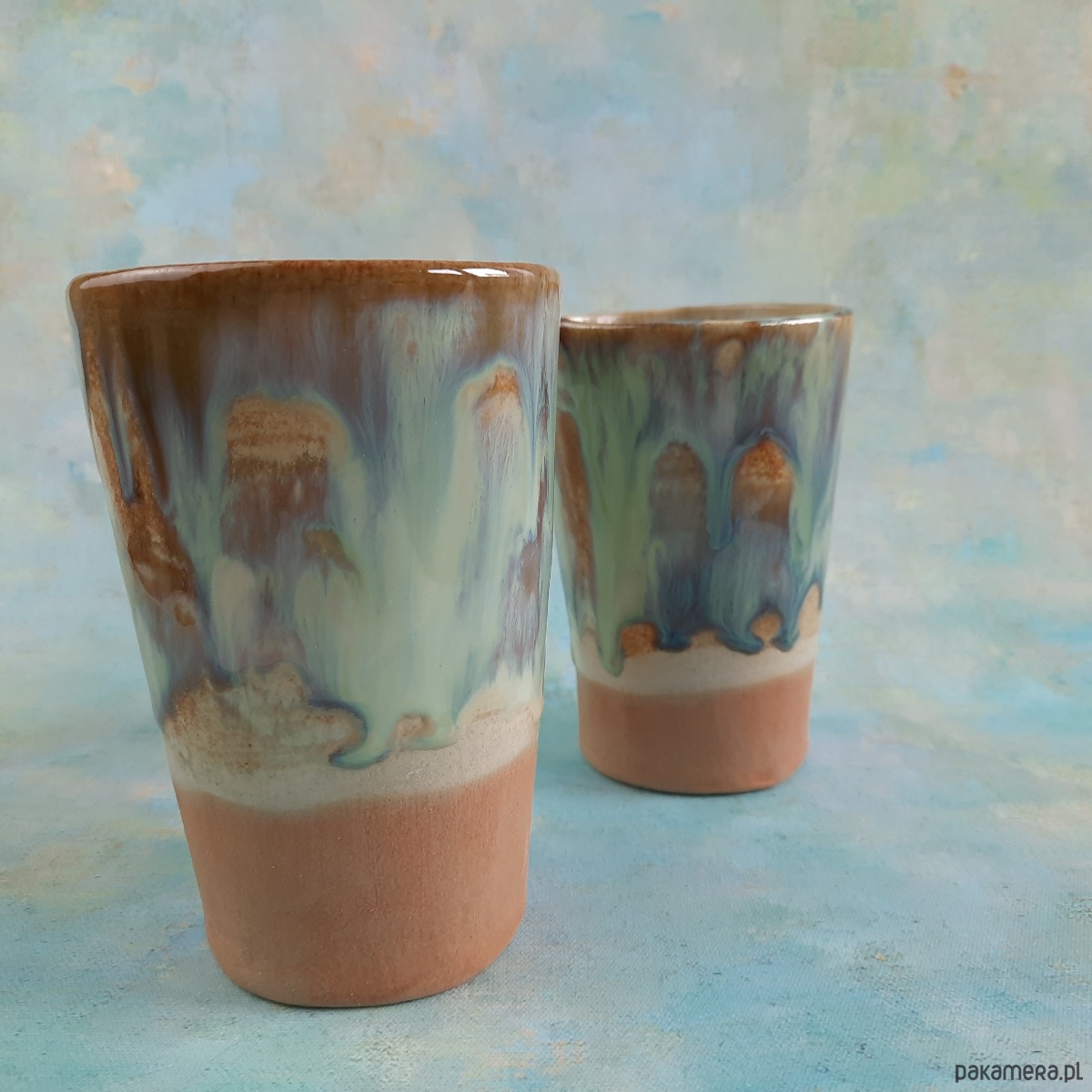 Efekt przypomina naturalne krajobrazy – ziemię, mgłę i krople wody. To połączenie kolorów nadaje kubkom spokojny, rzemieślniczy charakter.