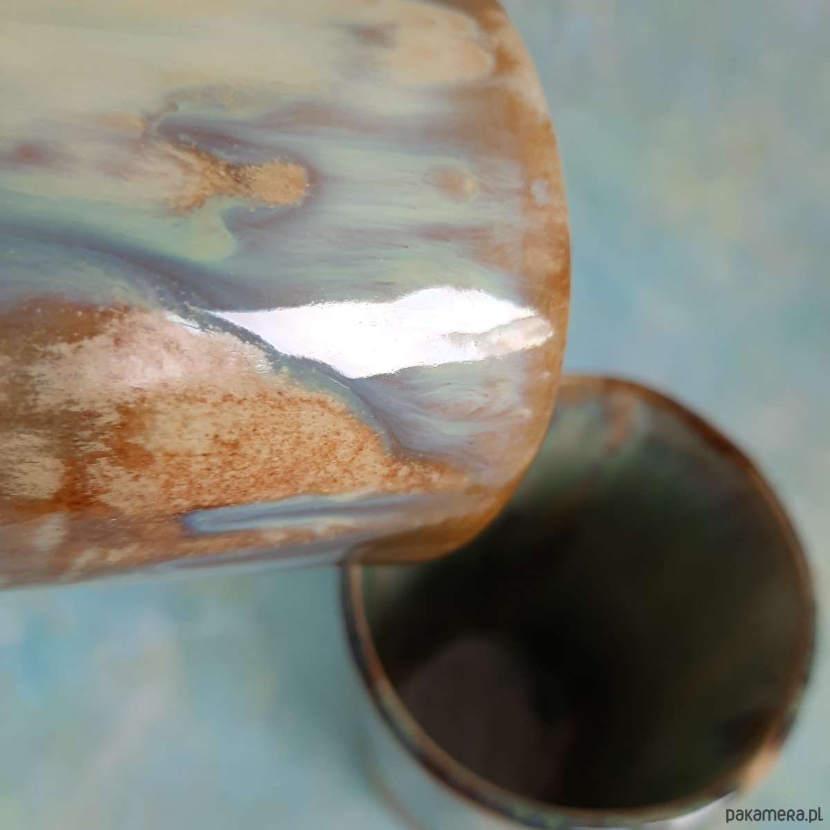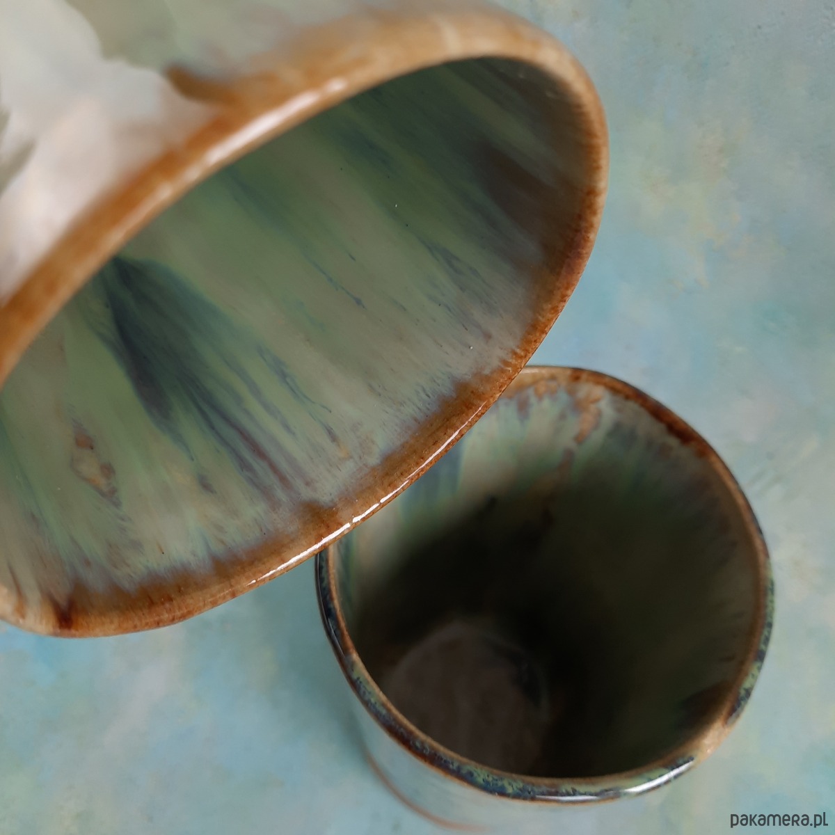 Charakterystyczne, warstwowe szkliwienie przyciąga wzrok. Ciepły, surowy odcień gliny u podstawy łączy się z pieknym szkliwem.