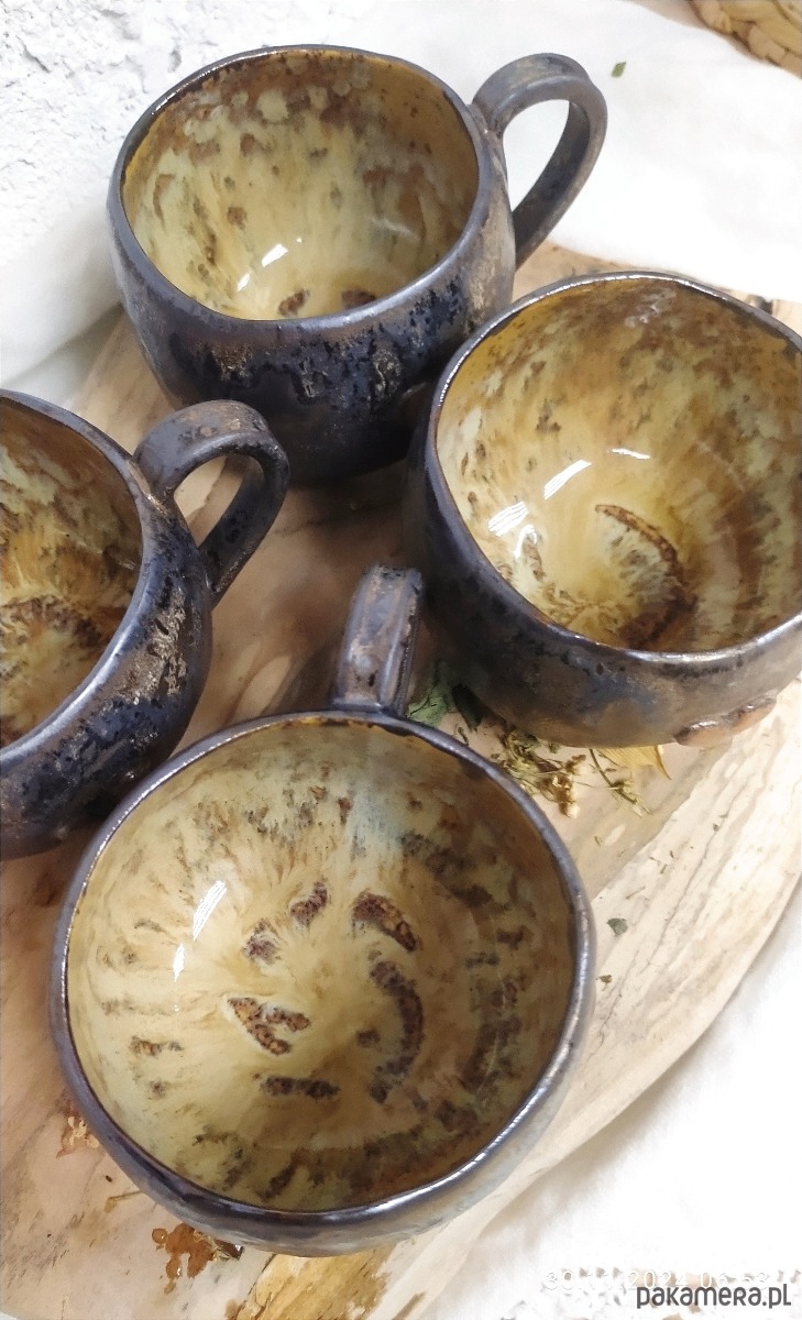 Piękna kolorystyka z zewnątrz stare złoto, natomiast wewnątrz szkliwo w kolorze kawy z mlekiem.