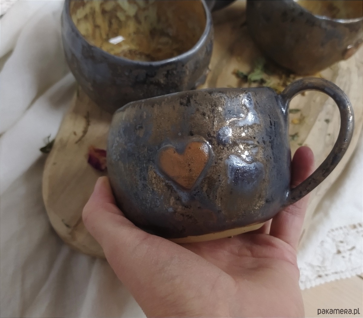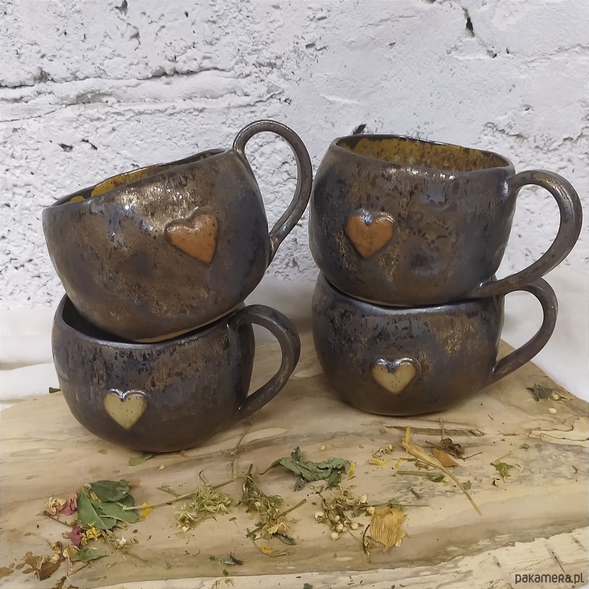 Kubek ceramiczny ręcznie robiony z serduszkiem złoto- brązowy 300 ml
