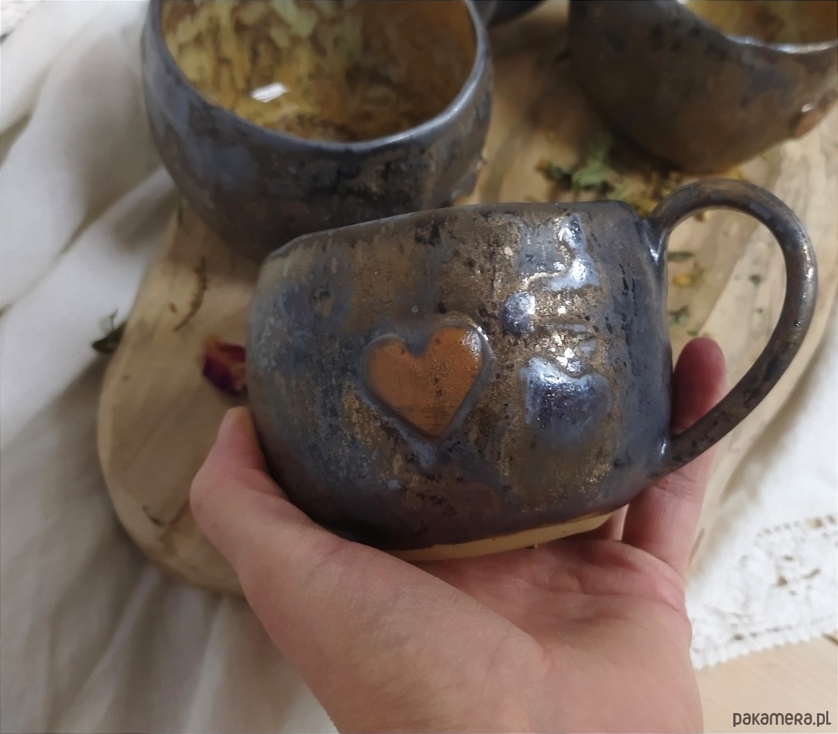Unikatowu kubek ceramiczny z serduszkiem, lepiony ręcznie od podstaw z kulki gliny.