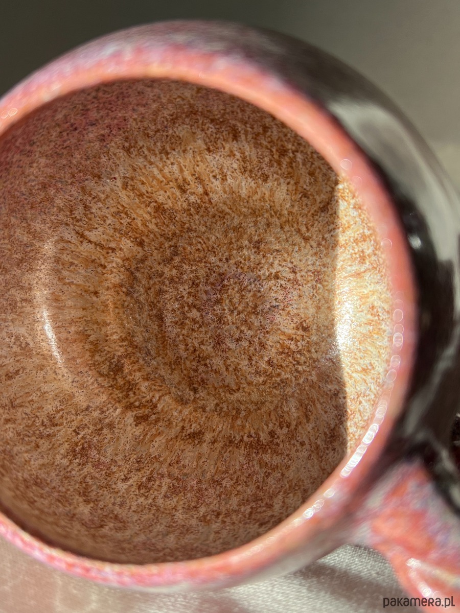 Ten kubek to pełnia ciepłych barw – od głębokiej czerwieni po delikatne, niemal pastelowe muśnięcia różu, żółci i szarości. Jego powierzchnia przypomina niebo podczas zachodu słońca albo rozgrzaną skałę w promieniach popołudniowego światła. To kubek, który przyciąga wzrok, ale pozostaje harmonijny i naturalny.