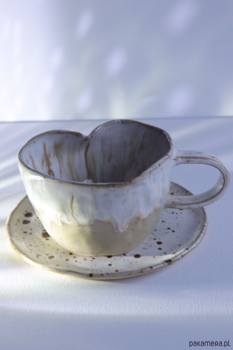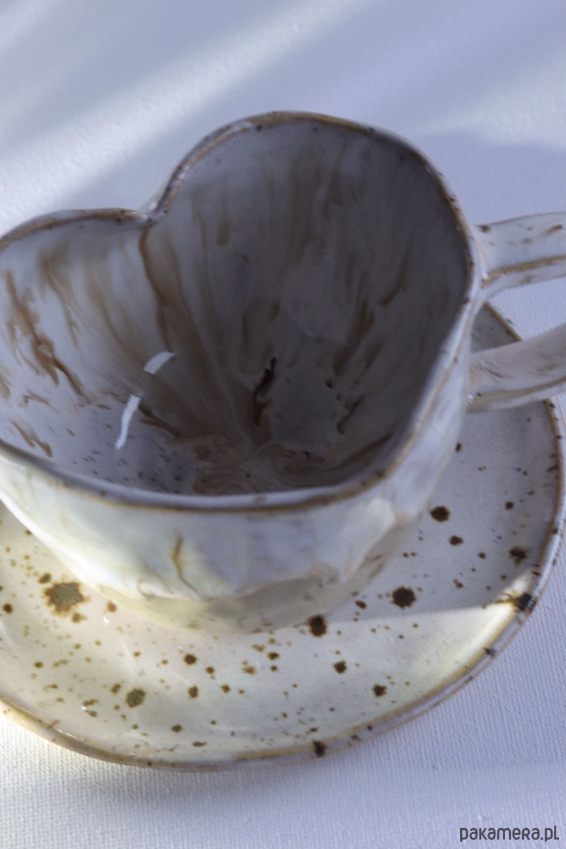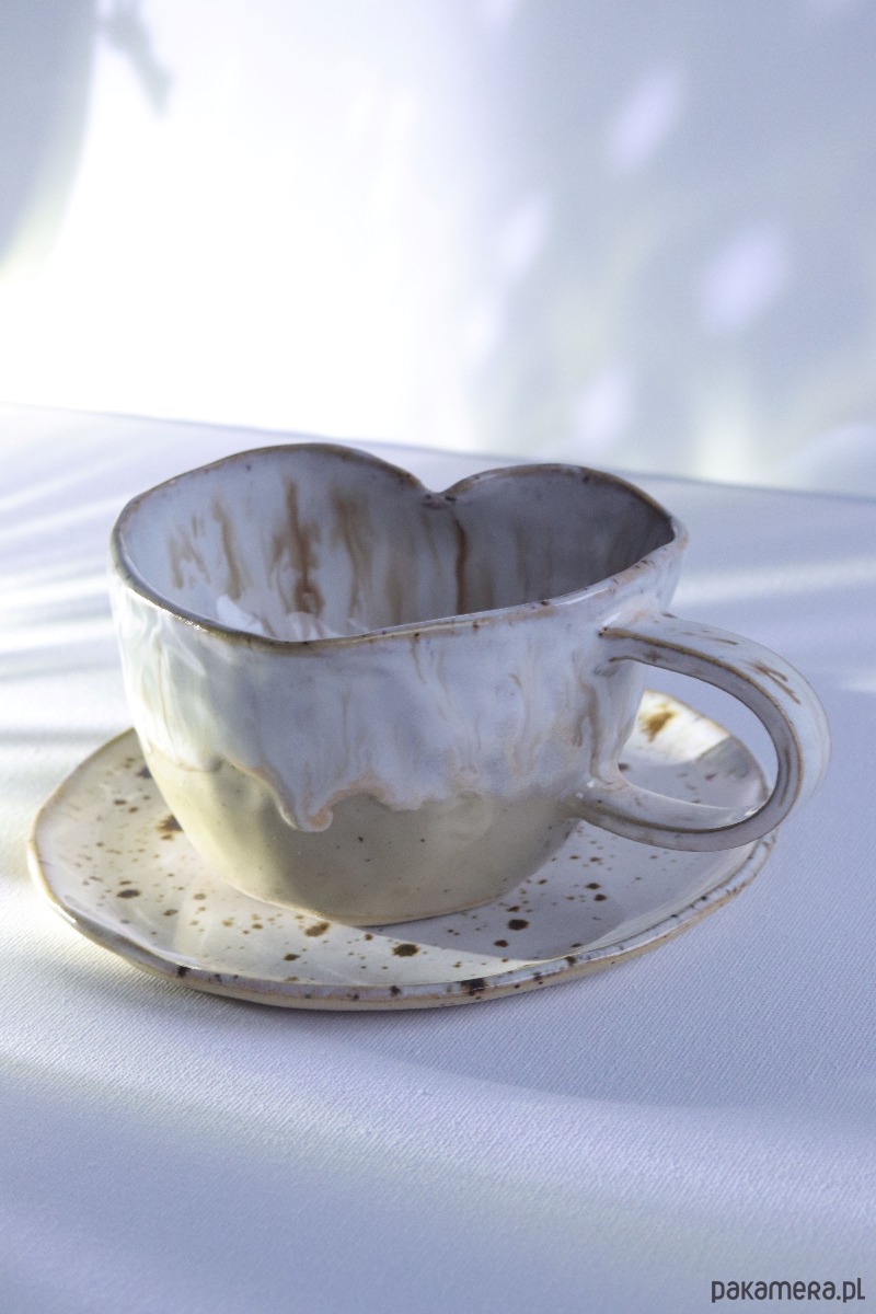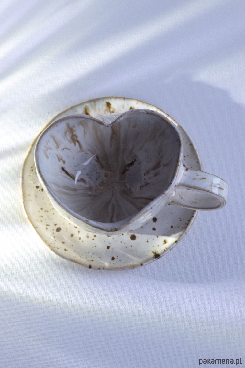 Ten wyjątkowy kubek w kolorze cappuccino zachwyca już od pierwszego spojrzenia. Ręcznie wykonany i uformowany w subtelny kształt serca, łączy w sobie ciepło rzemiosła z delikatną elegancją. Jego powierzchnię zdobi efekt „spływającego cappuccino” – harmonijne przenikanie odcieni brązu i bieli, które przywodzi na myśl spokojny poranek z ulubioną kawą. Każdy egzemplarz jest niepowtarzalny, dzięki czemu kubek staje się małym dziełem sztuki użytkowej.