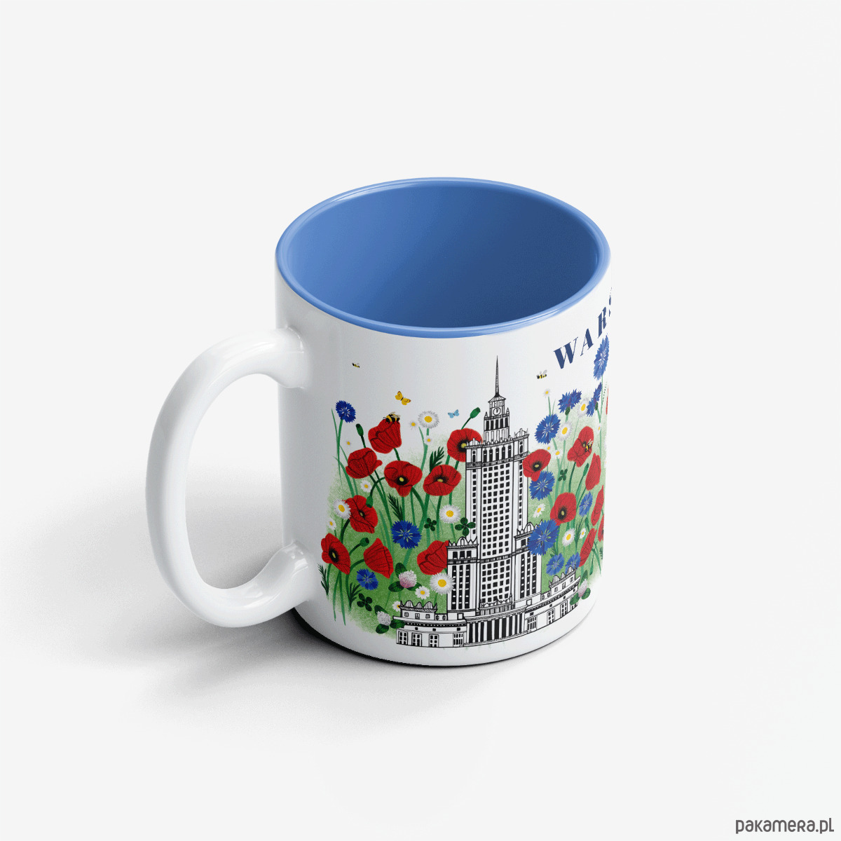 Kubek ceramiczny z białym środkiem z motywem Pałacu Kultury w Warszawie.