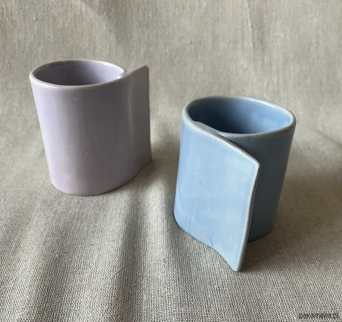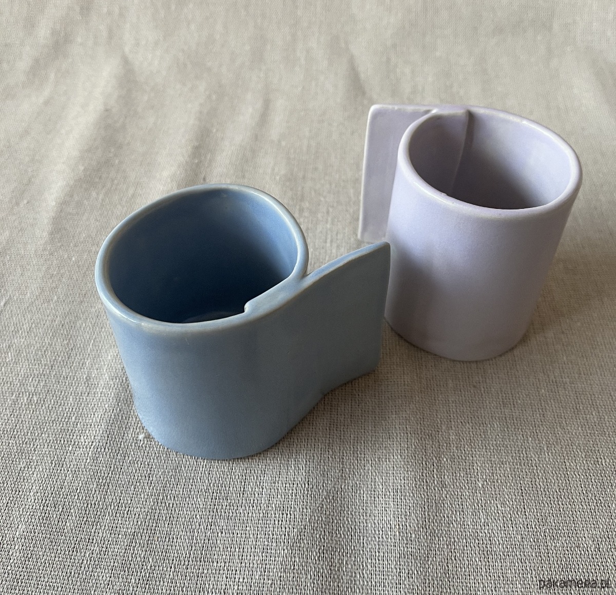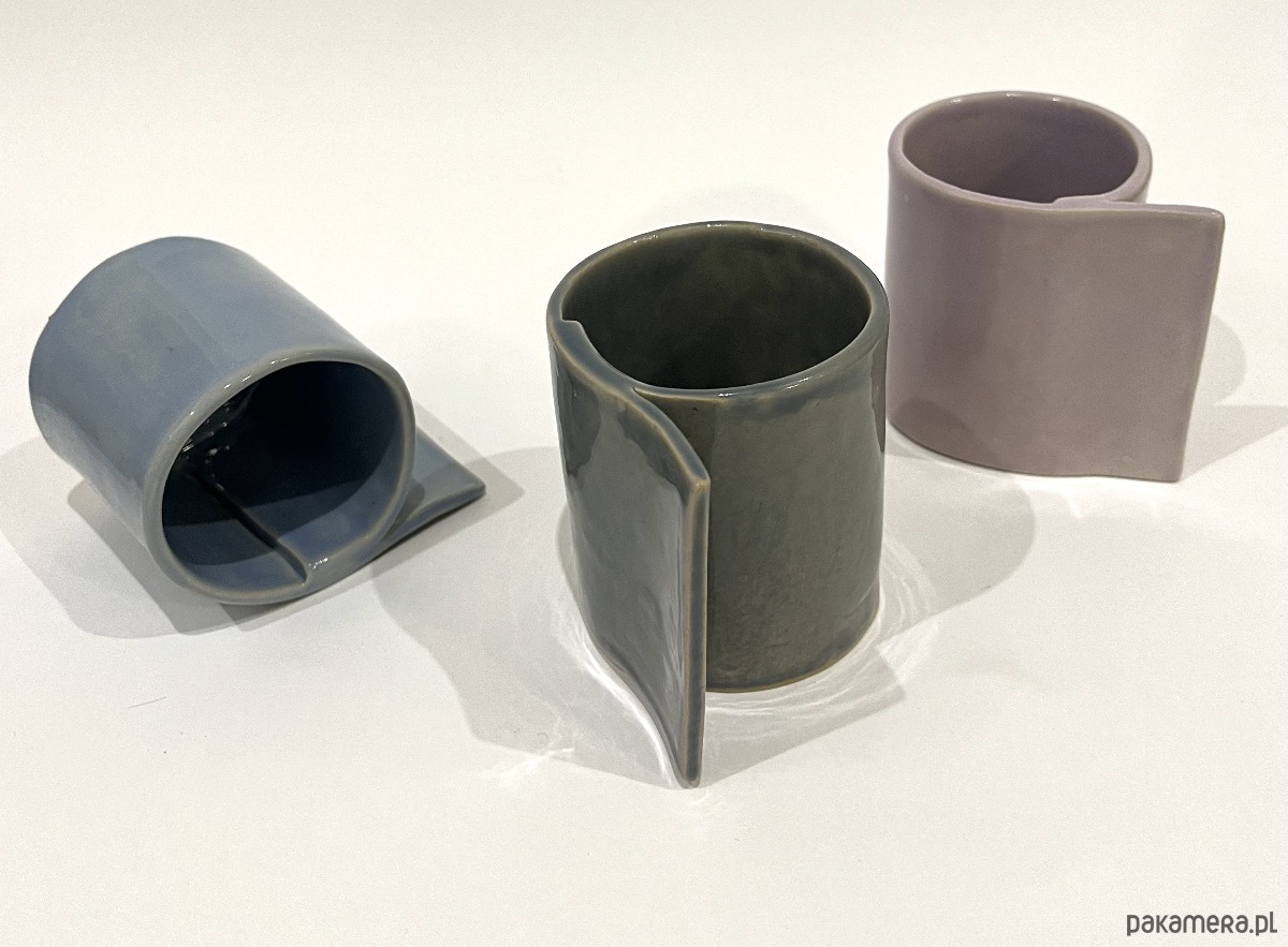 Kubeczki ceramiczne przypominające kartkę papieru w kolorze niebieskim i różowym