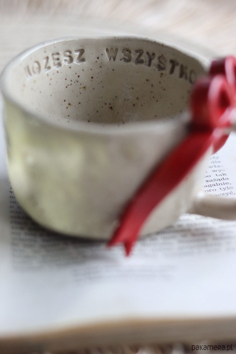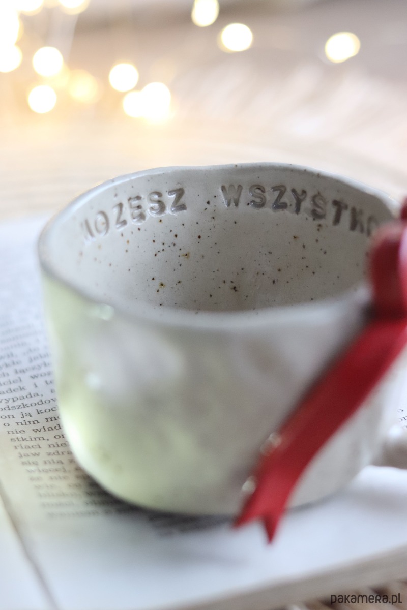 Ręcznie wykonany kubek ceramiczny z motywacyjnym napisem MOŻESZ WSZYSTKO, który powstał z myślą o osobach potrzebujących codziennej dawki pozytywnej energii. Kubek ulepiłam własnoręcznie z gliny, dbając o każdy szczegół, aby stworzyć przedmiot nie tylko użytkowy, ale również inspirujący. Jego wyjątkowym elementem jest dekoracyjna, czerwona kokarda, która nadaje mu niepowtarzalnego, radosnego charakteru i sprawia, że idealnie sprawdzi się jako prezent – zarówno dla bliskiej osoby, jak i dla samego (ej) siebie.