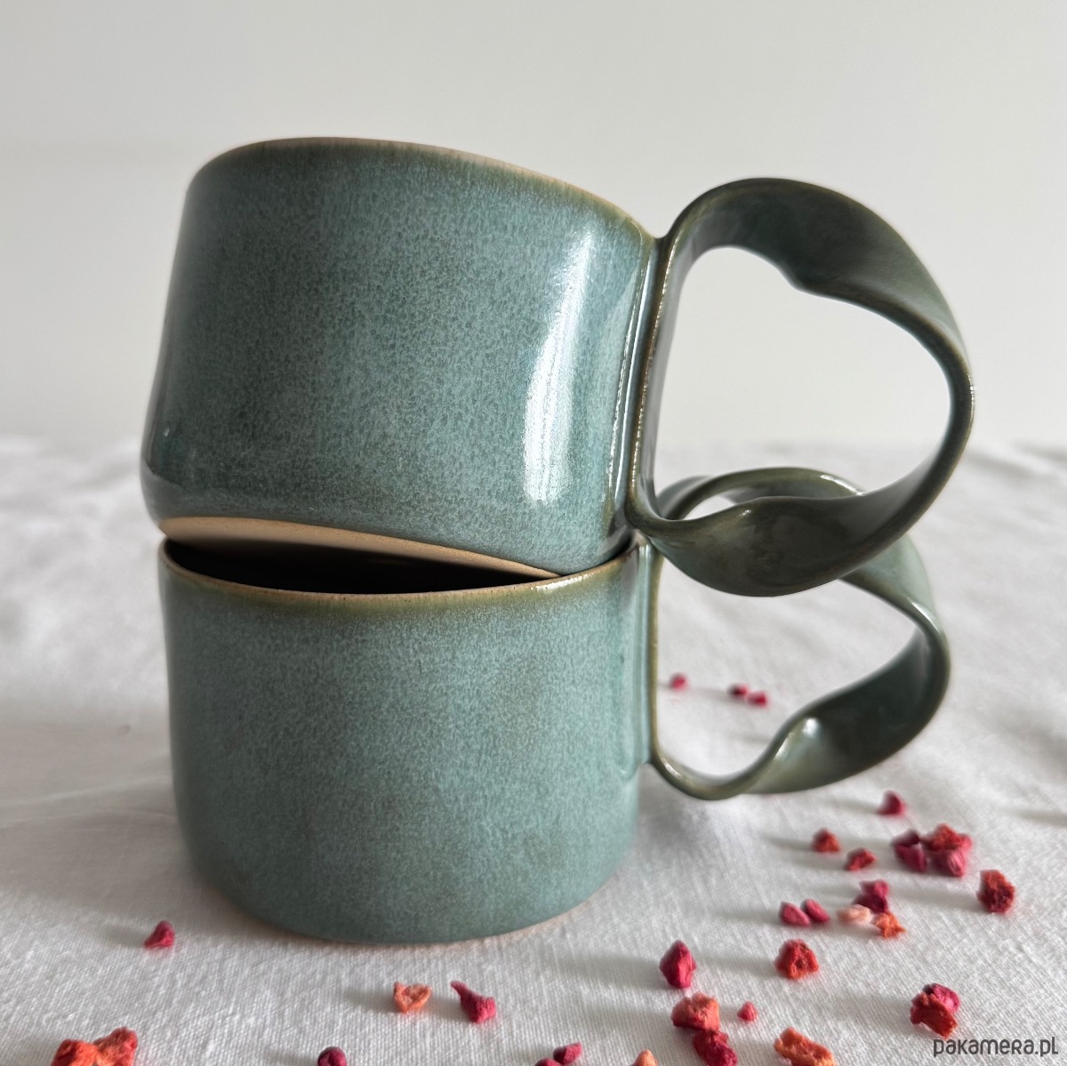 Ręcznie robiony ceramiczny kubek z ciekawym uchwytem w formie wstążki.