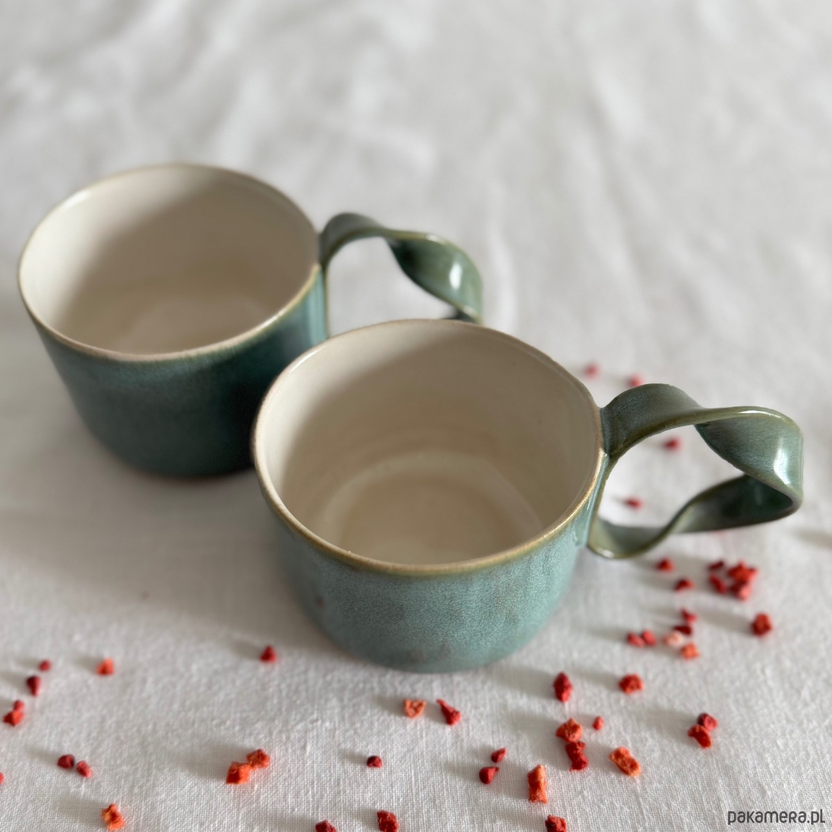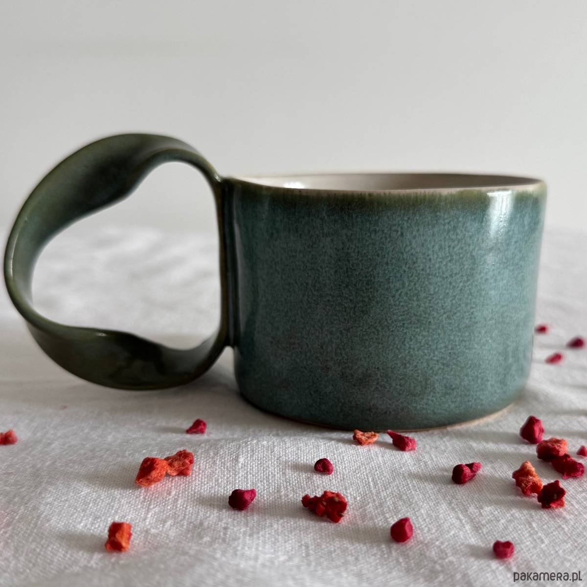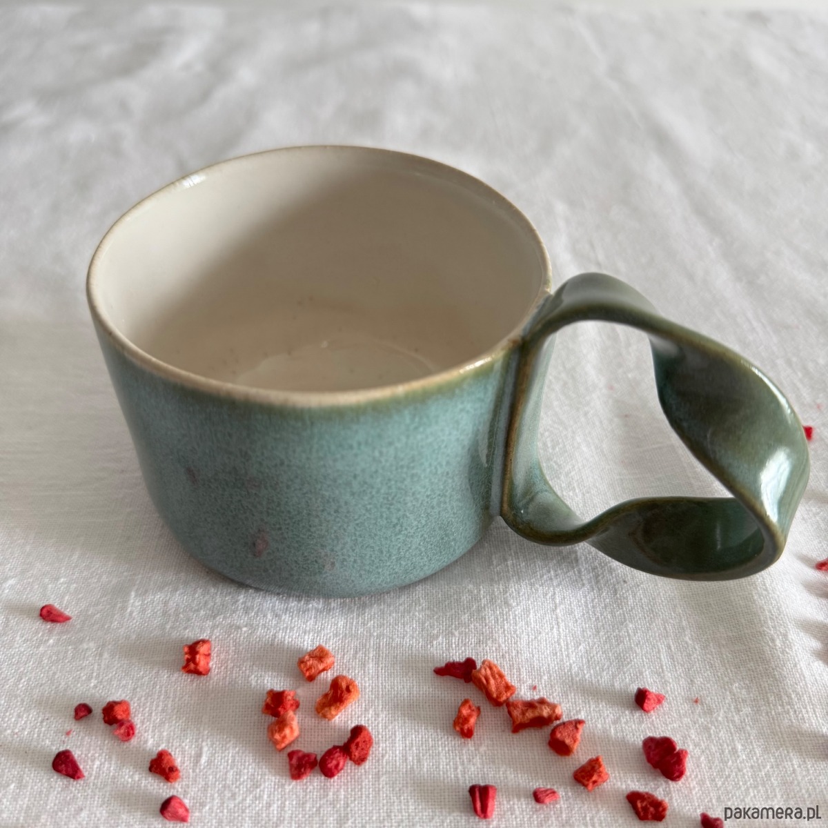 Kubek jest wykończony niepowtarzalnym szkliwem o odcieniach turkusu z odcieniami zieleni. Wnętrze pokryte jest mleczno białym szkliwem.