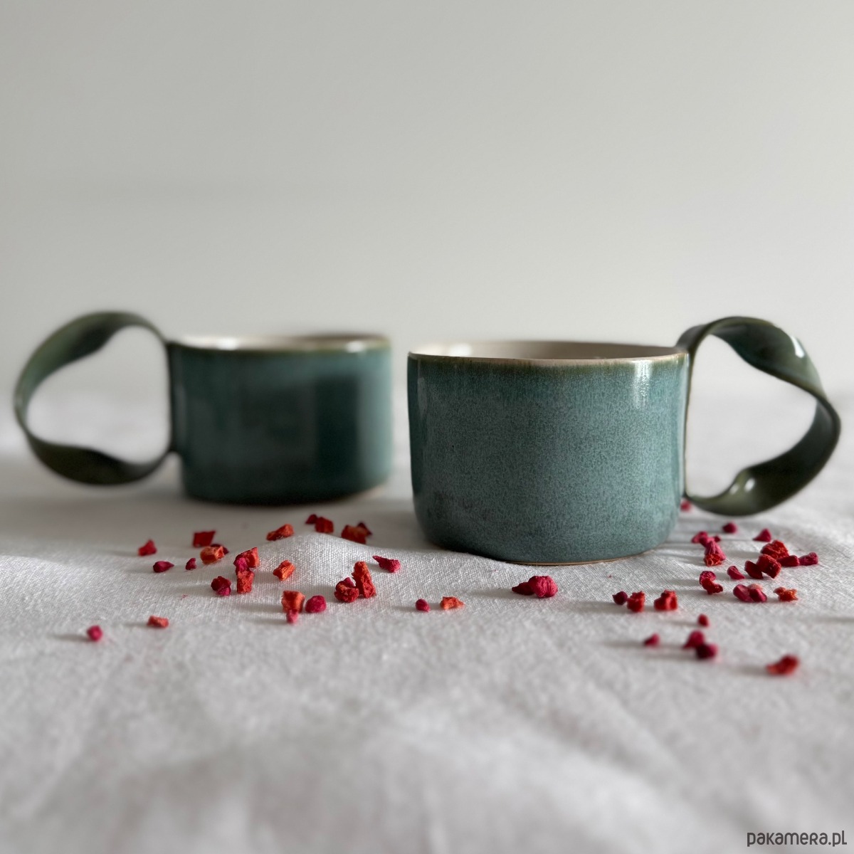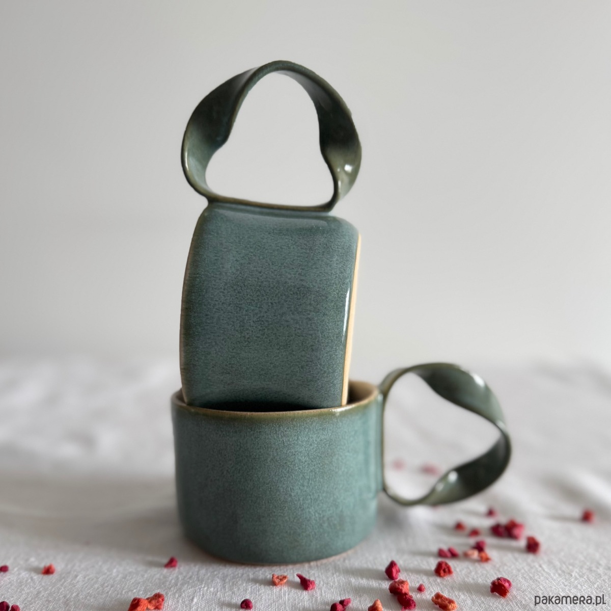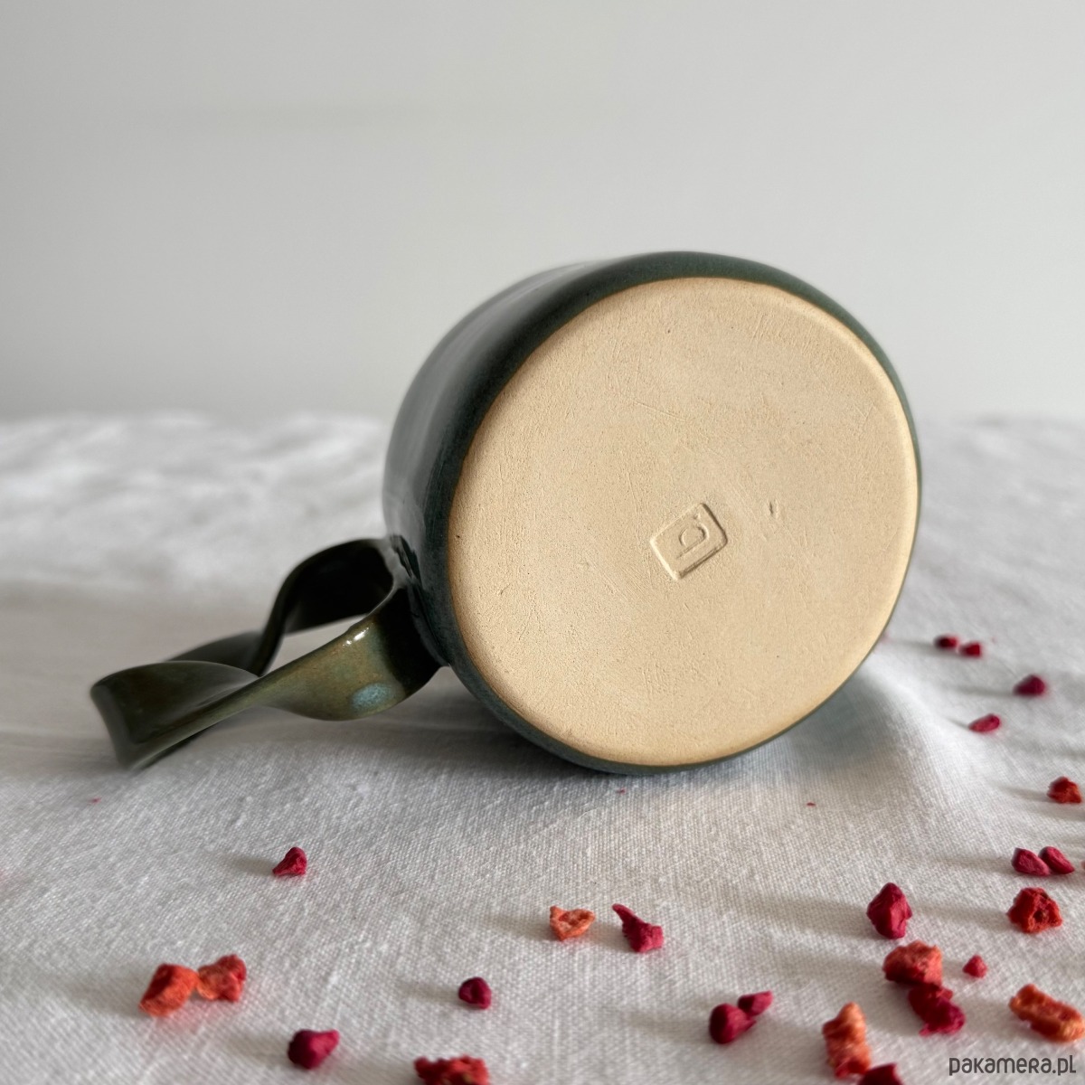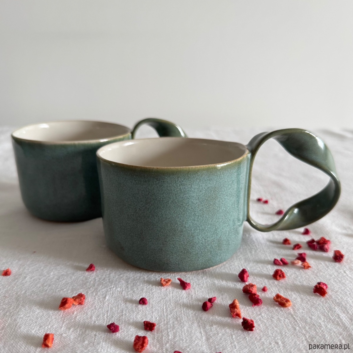 Kubek jest wykończony niepowtarzalnym szkliwem o odcieniach turkusu z odcieniami zieleni. Wnętrze pokryte jest mleczno białym szkliwem.