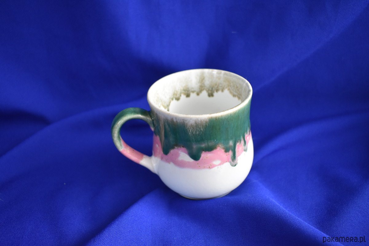 Ręcznie szkliwiony kubek ceramiczny utrzymany w klasycznym zestawieniu bieli z zielenią, oraz różowym akcentem. Przejścia między kolorami nadają mu unikalny charakter.