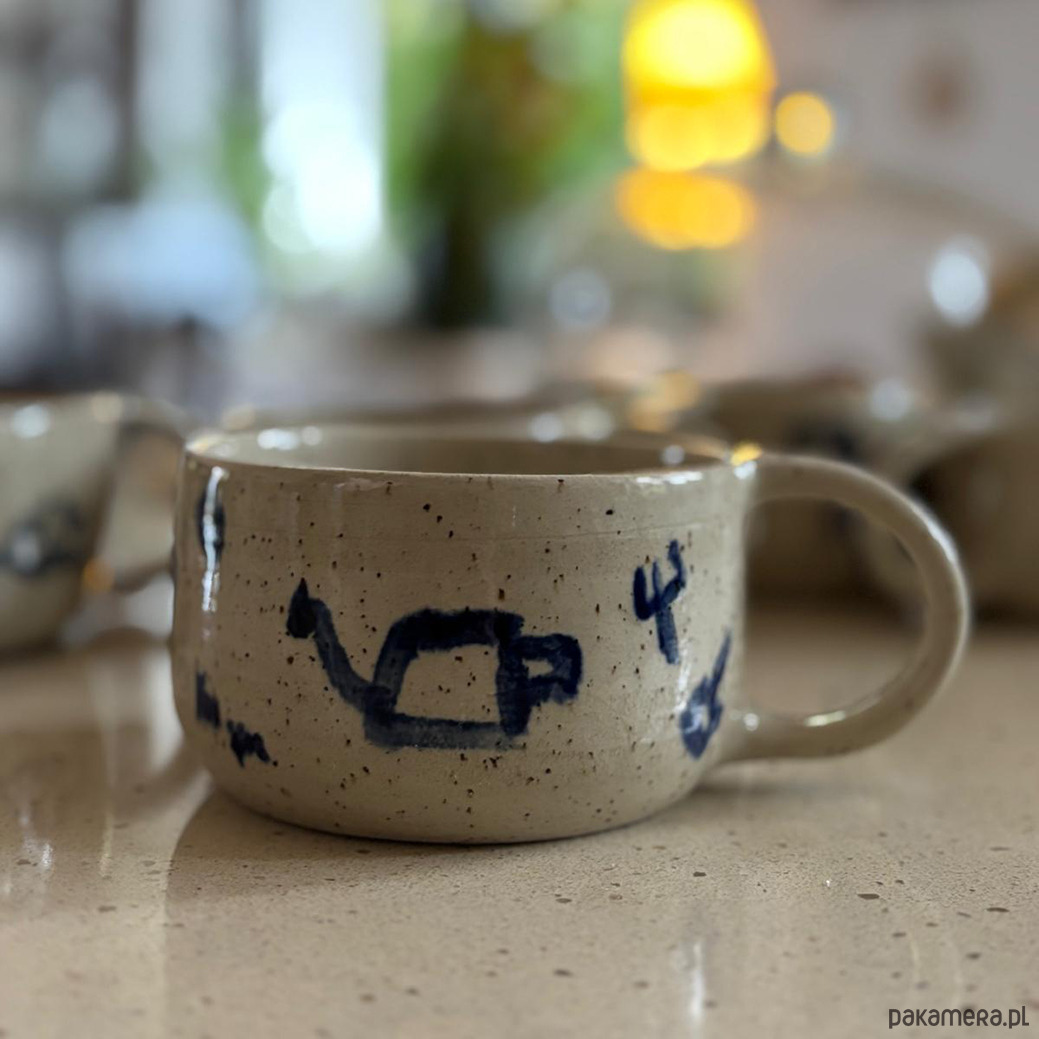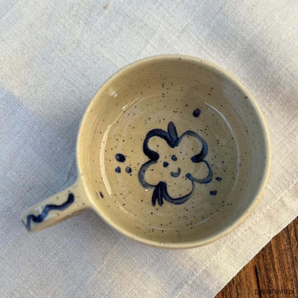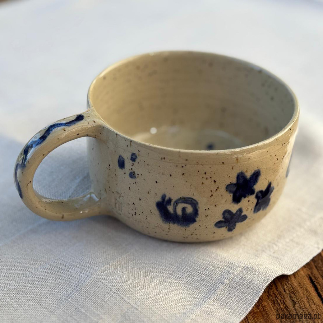 Kubek lepiony ręcznie na kole z jasnokremowej gliny w kropki. Malowany granatową farbką z zewnątrz i wewnątrz.