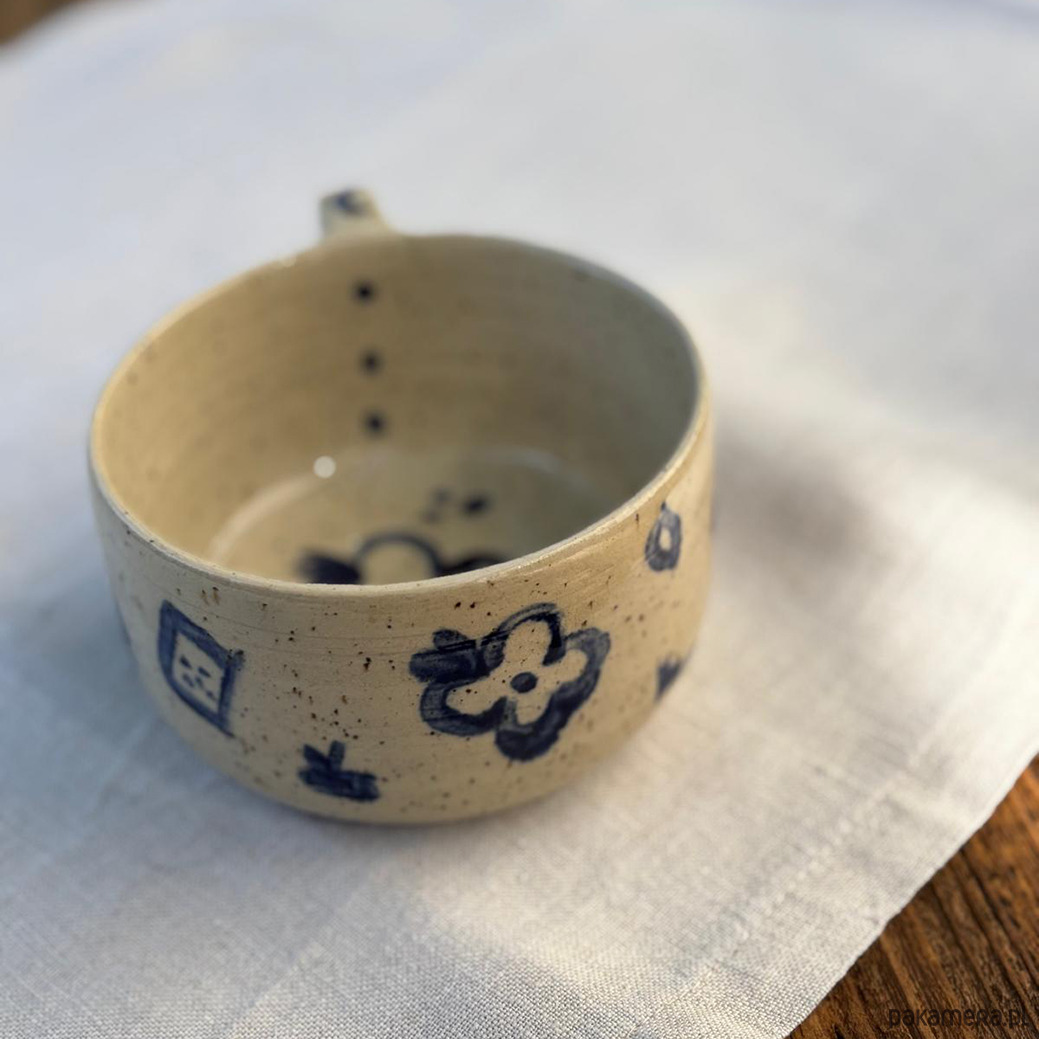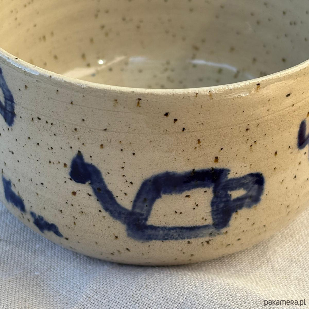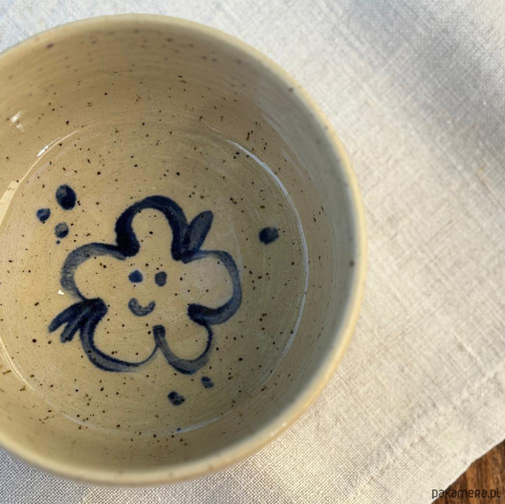 Kubek lepiony ręcznie na kole z jasnokremowej gliny w kropki. Malowany granatową farbką z zewnątrz i wewnątrz.