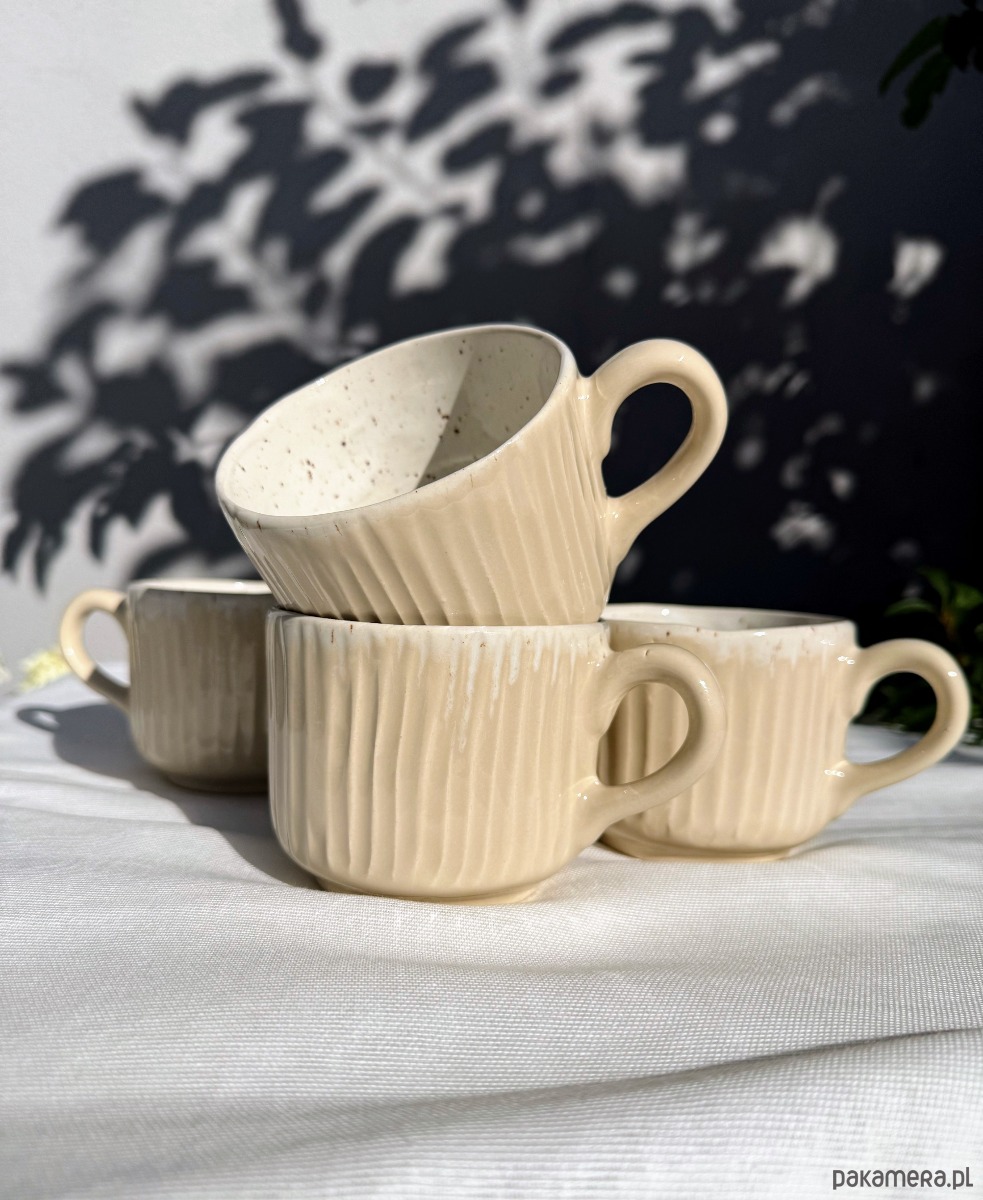 Kubek w kolorze ciepłego beżu, wewnątrz biały z piegami. Idealny na większą herbatę, zioła, kawę bądź czekoladę. Każda sztuka jest unikatowa, wykonana z jasnej gliny.
