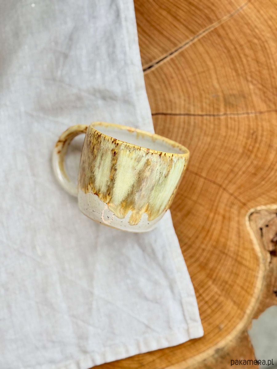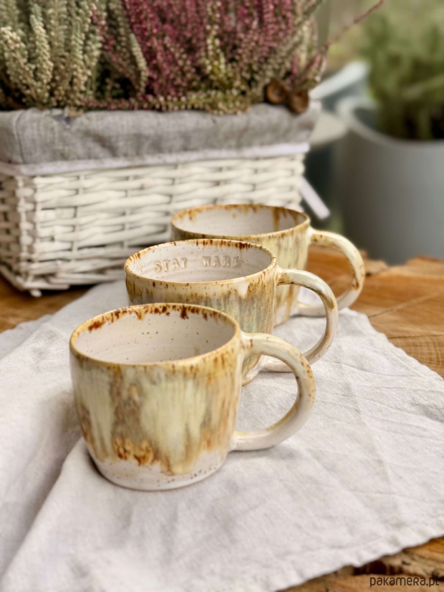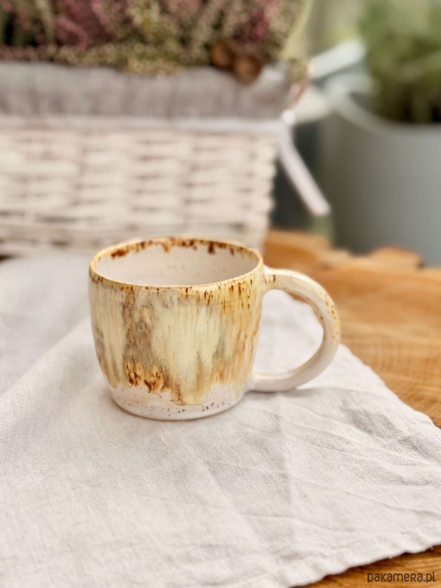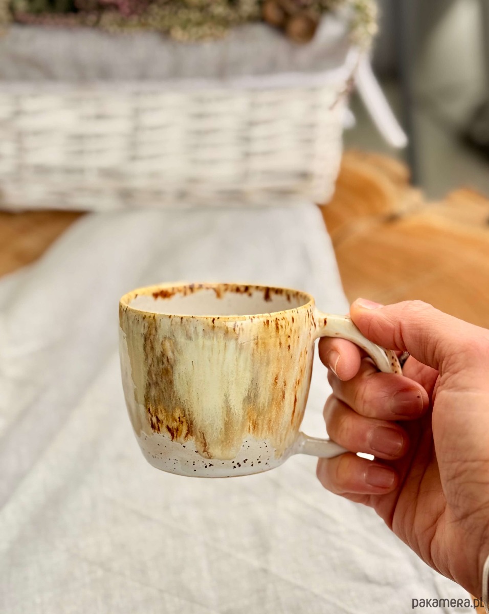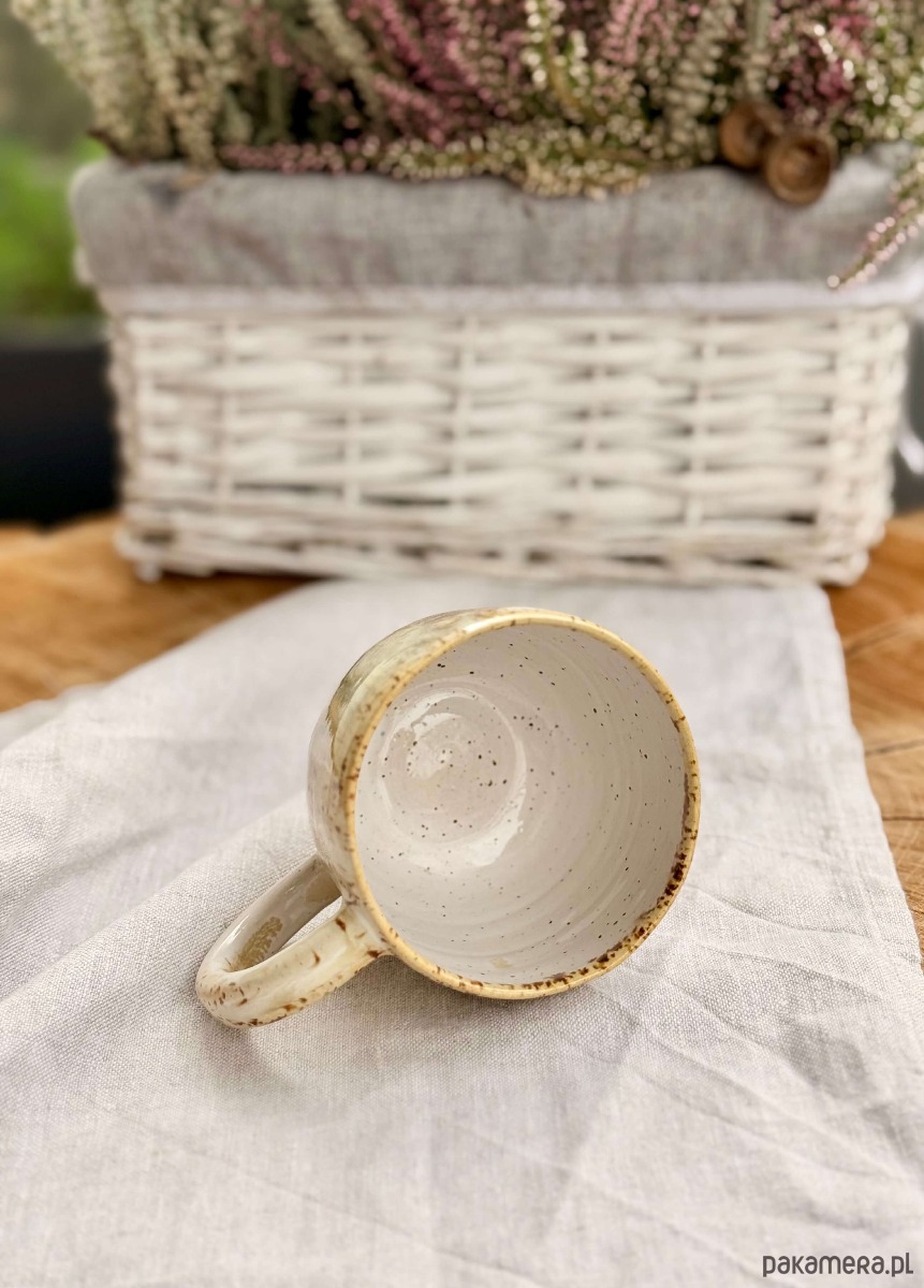 Kubek został wytoczony na kole garncarskim z miłością i lekką obsesją na punkcie dobrej kawy i herbaty.