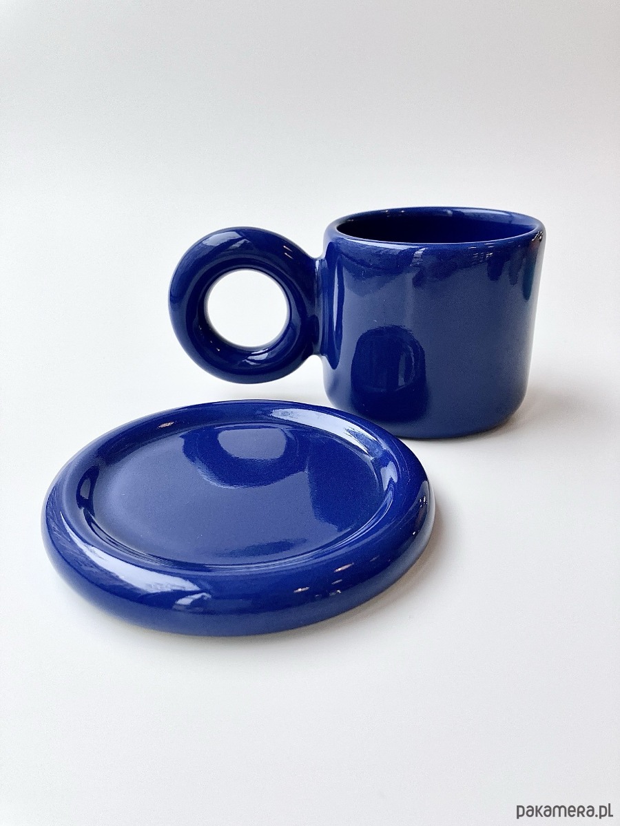 Elegancki kubek o pojemności 300 ml ze spodkiem to wyjątkowa propozycja dla miłośników designu i codziennych rytuałów, z kawą lub herbatą. Wyróżnia się głębokim, kobaltowym kolorem oraz oryginalnym uchwytem w formie okręgu, który nadaje mu nowoczesny, rzeźbiarski charakter i przyciąga wzrok.