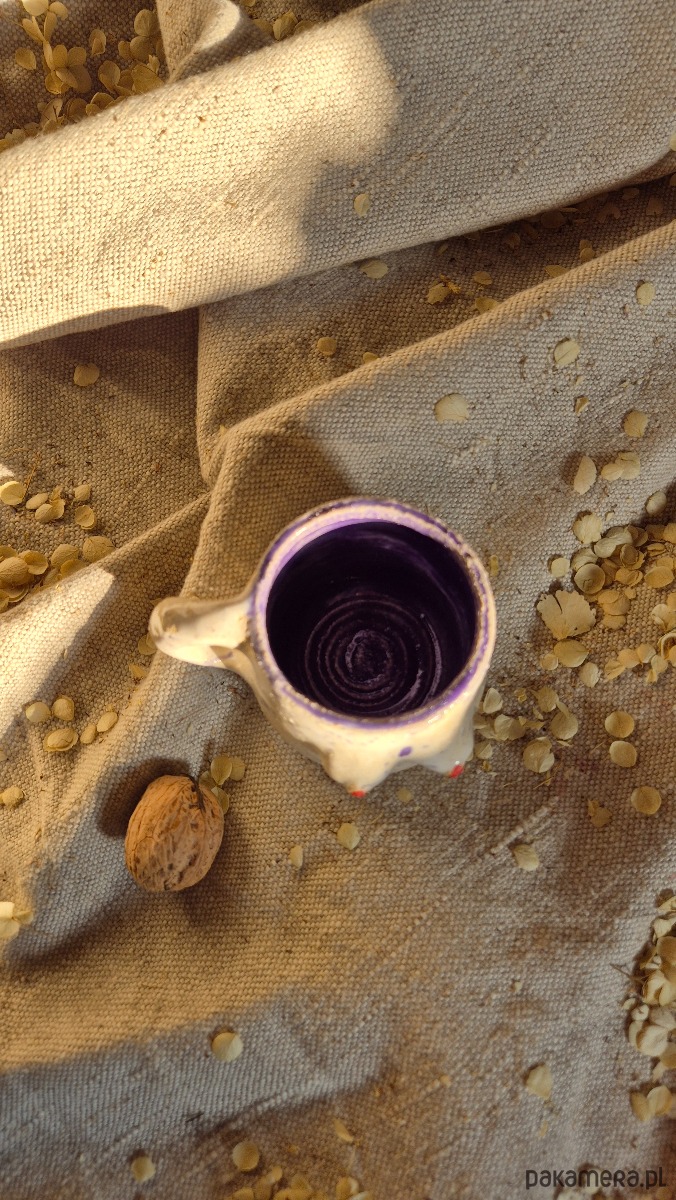 Kubek ceramiczny toczony i rzeźbiony – biało fioletowy. Pojemność 110 ml.
