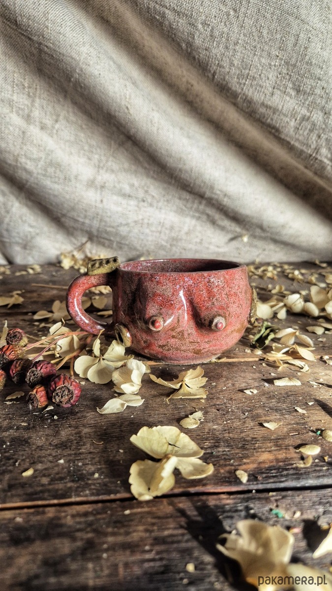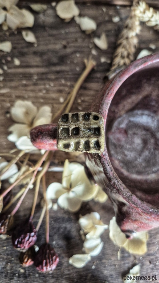 Kubek z uszkiem, cycuszki różowo złote. Cyckowy kubek 230 ml. Wypał na 1250 stopni. Cycki kubek z uszkiem i rzeźbionymi ciasteczkami w około i gofrem na uszku. Można myć w zmywarce.
