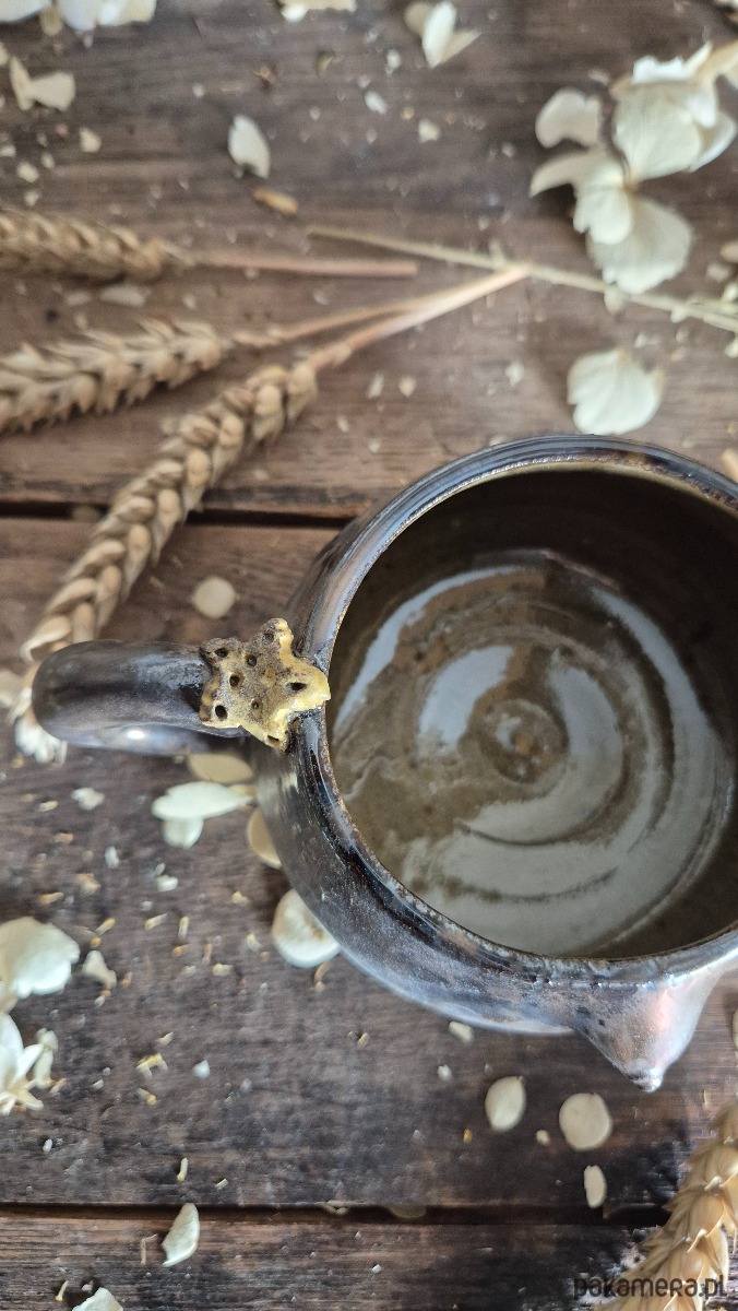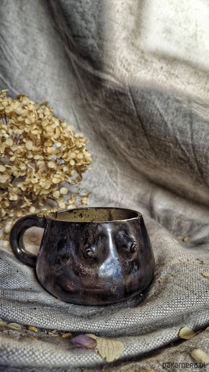 Kubek z uszkiem, cycuszki złote. Środek ciemny musztardowy, z zewnątrz złote szkliwo, glina pieprz i sól. Cyckowy kubek 200 ml z rzeźbionymi cycuszkami. Wypał na 1250 stopni. Na uchwycie rzeźbione ciasteczko w ksztalcie gwiazdki. Można myć w zmywarce. Złote cycuszki na kawę lub herbatę.