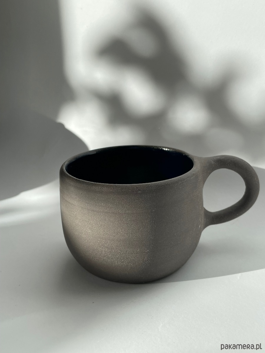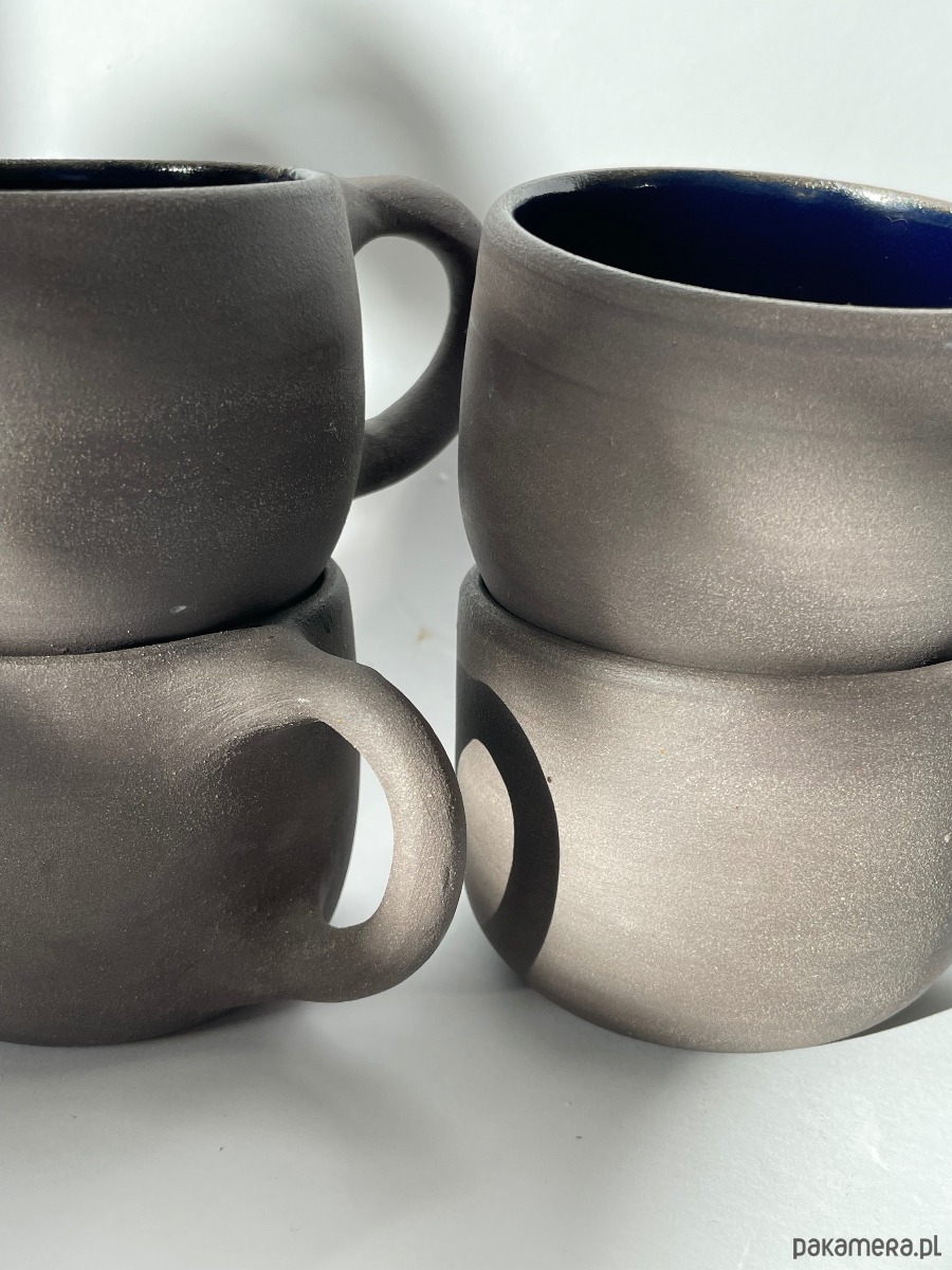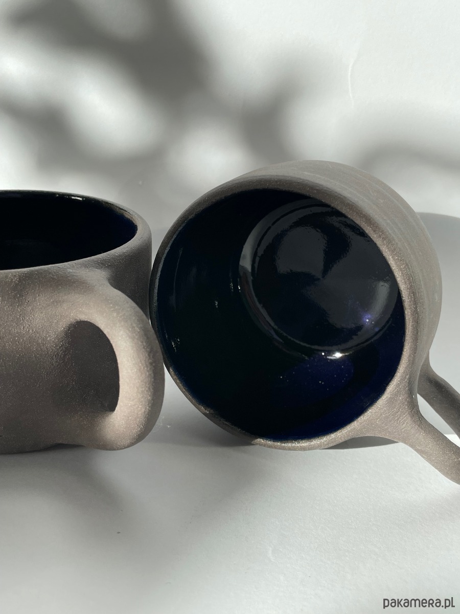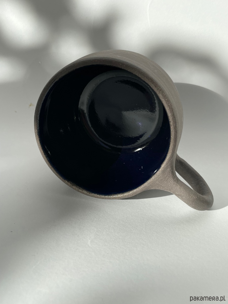 Ręcznie wykonany kubek z czarnej gliny. Wnętrze pokryte jest błyszczącym kobaltem, które pięknie kontrastuje z surową powierzchnią gliny.