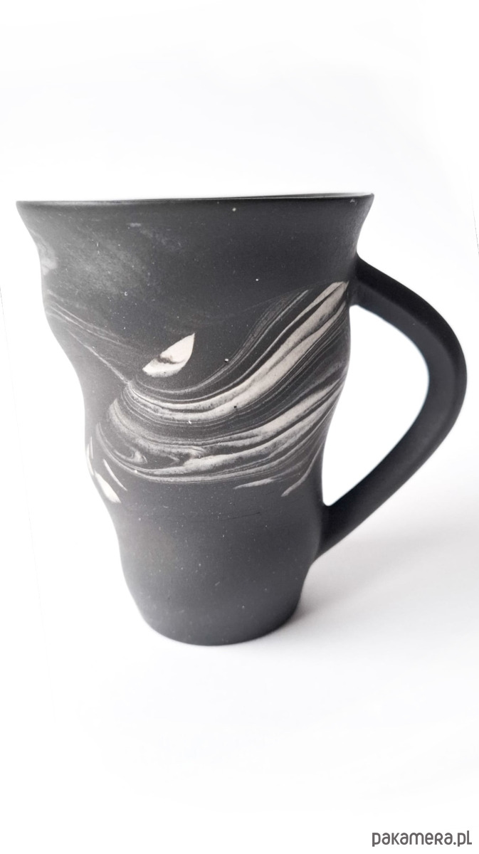 Kubek ma charakterystyczny kształt nawiązujący do ludowej ceramiki, toczonej na kole garncarskim. Wykonany jest ręcznie z barwionej masy kamionkowej i wypalony w temperaturze 1250 st.C. Dzięki zastosowaniu dwóch kolorowych mas i specyficznej technologii dwukrotnego odlewania, każdy z kubków jest niepowtarzalny. Przypadkowość powstałych smug jest nie do powtórzenia.