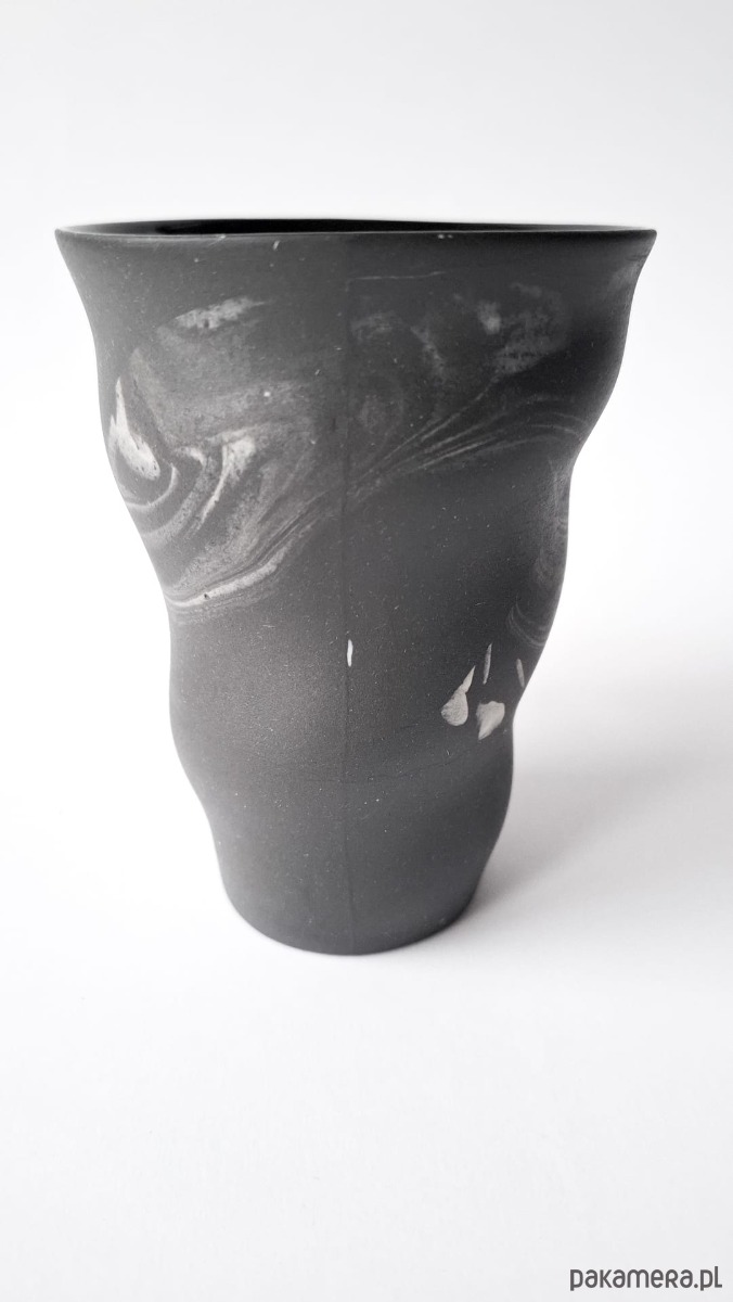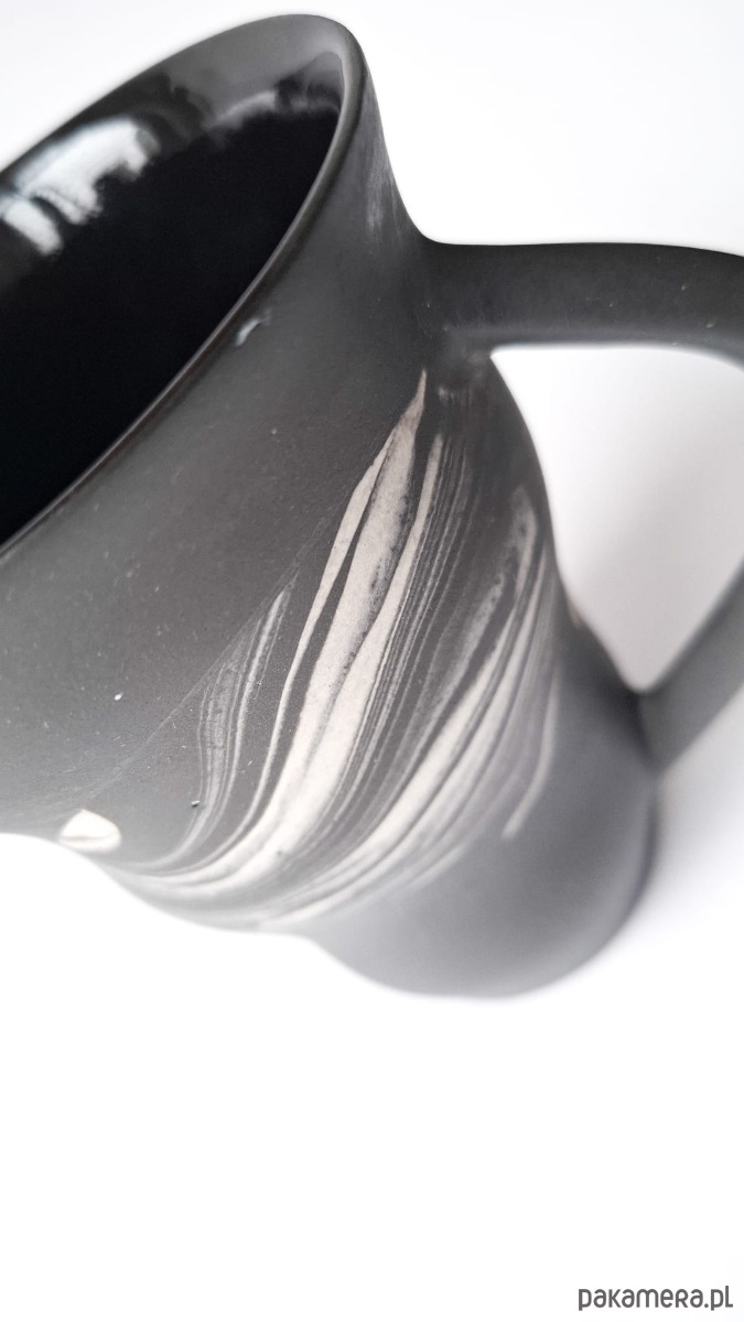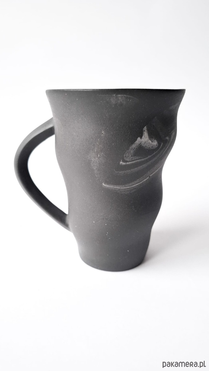 Matowo-grafitowa zewnętrzna część jest nieszkliwiona, polerowana, dzięki czemu uzyskujemy satynową powierzchnie rzecznego kamienia. Efekt matu na filiżance podbija błyszczące, czarne szkliwo położone w jego wnętrzu.