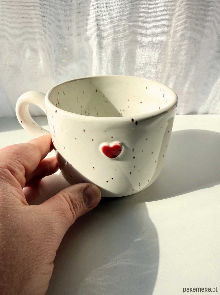 Minimalistyczny kubek z serduszkiem, pokryty białym szkliwem z piegami. Idealny na większą herbatę, zioła, kawę bądź czekoladę. Każda sztuka jest unikatowa, wykonana z jasnej gliny. Wszystkie nasze naczynia można myć w zmywarce. Pojemność ok 350 ml.