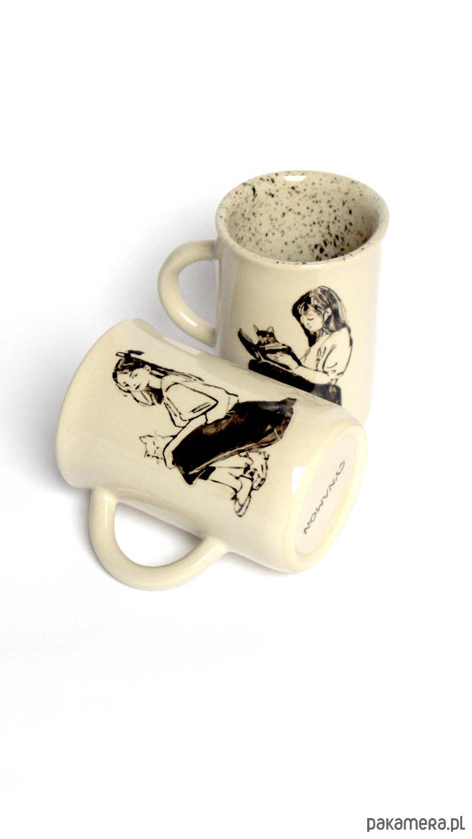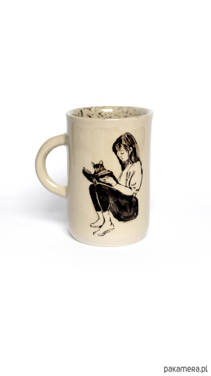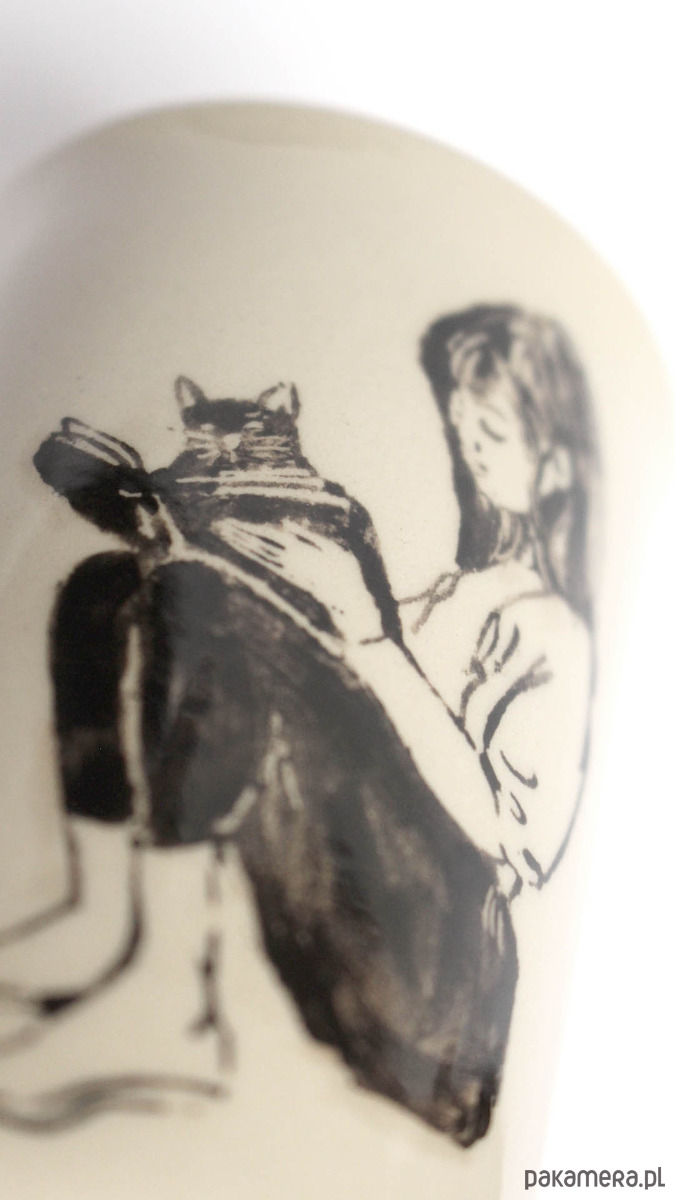 Kubek malowany czarnymi farbami podszkliwnymi, wykonany w małej krakowskiej pracowni ceramicznej. Zastosowano wysokiej jakości kremową gline kamionkową, 100% handmade. Szkliwiony transparentnym błyszczącym szkliwem. Sygnowany. Naczynie można myć w zmywarce.
