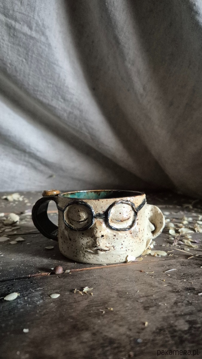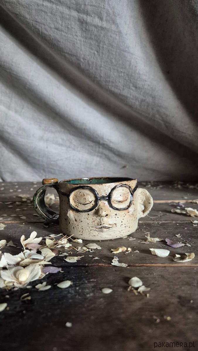 Unikatowy kubek ceramiczny, wykonany ręcznie na kole garncarskim i ozdobiony rzeźbionym motywem twarzy w okularach. Każdy detal powstał z uważnością i dbałością o charakter formy – od subtelnych rysów po organiczną fakturę szkliwa.