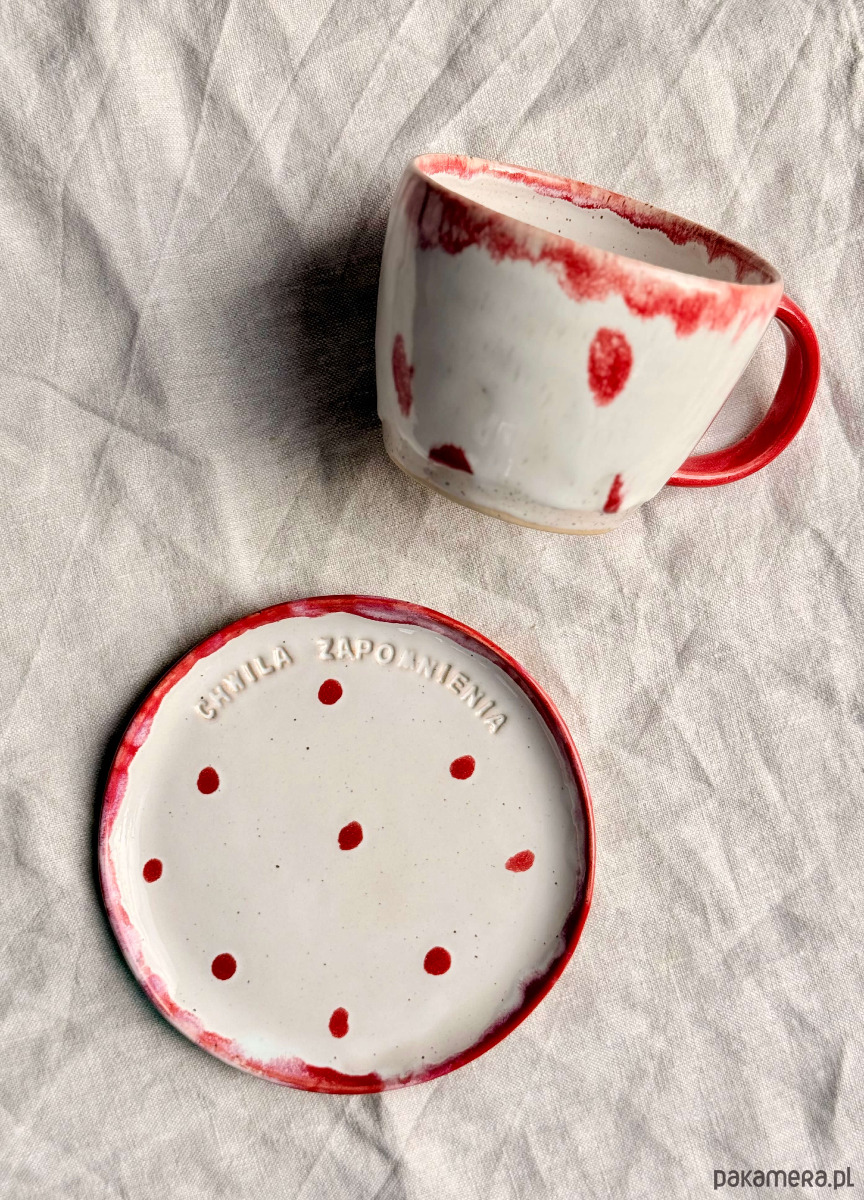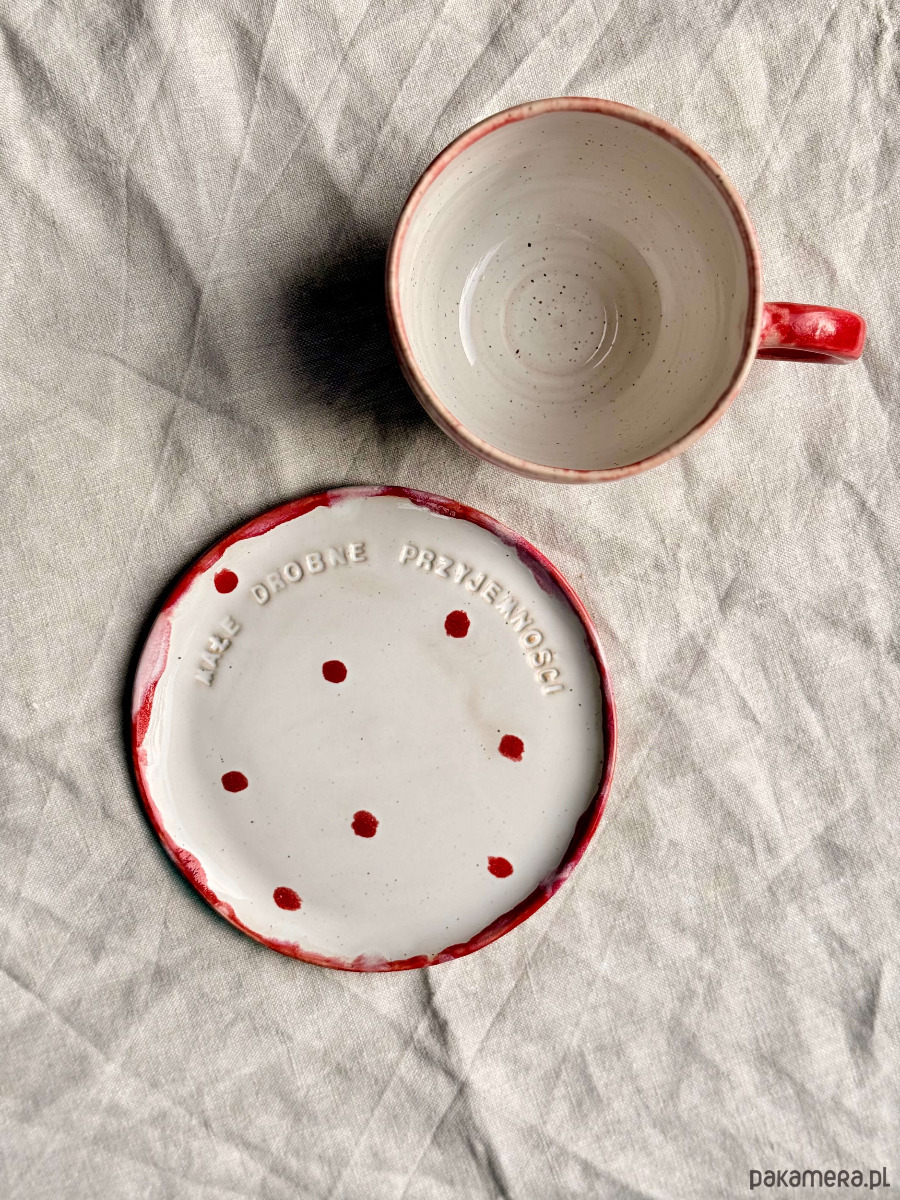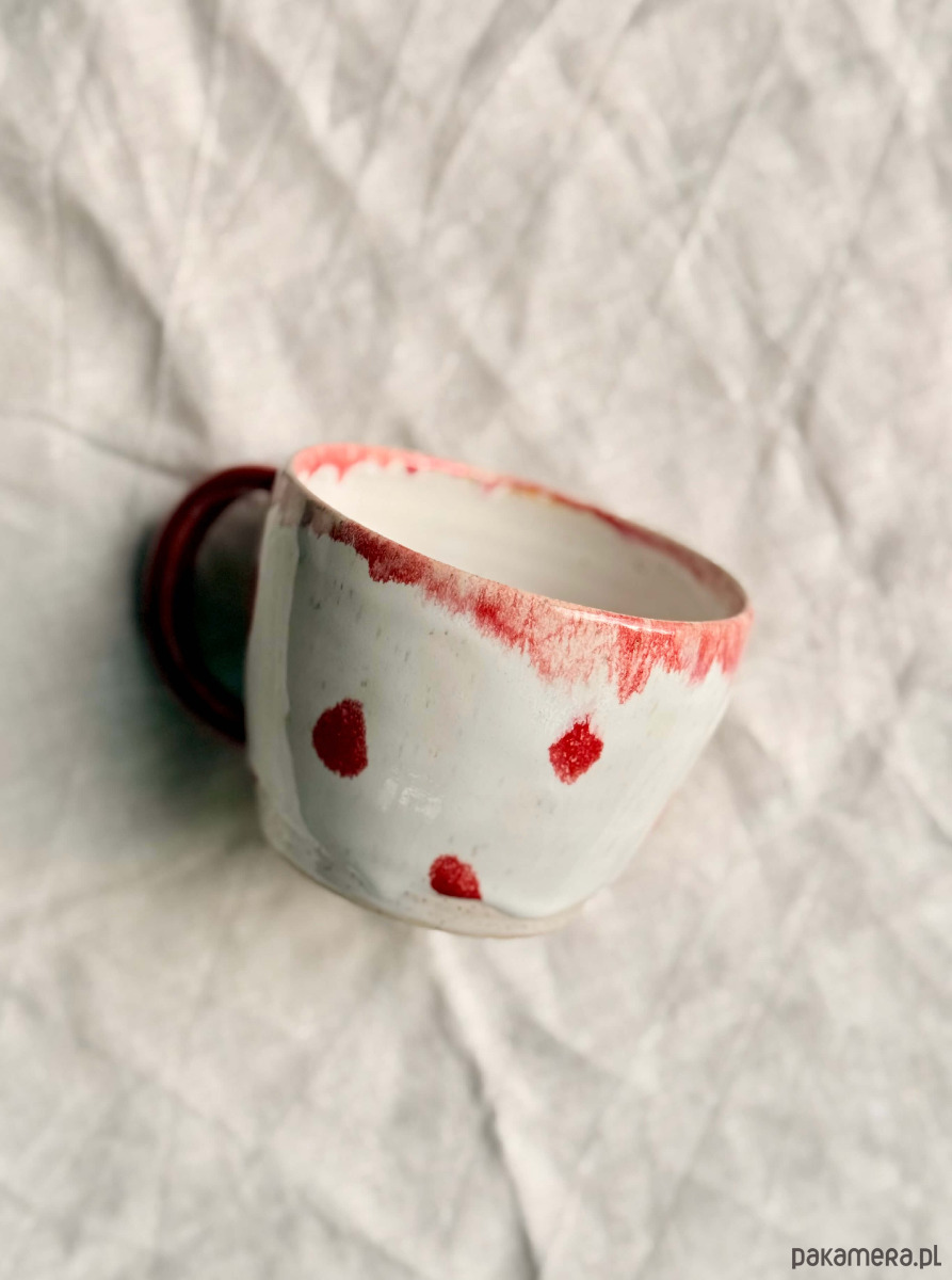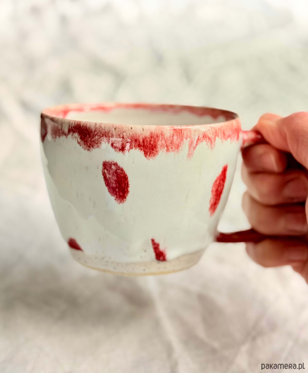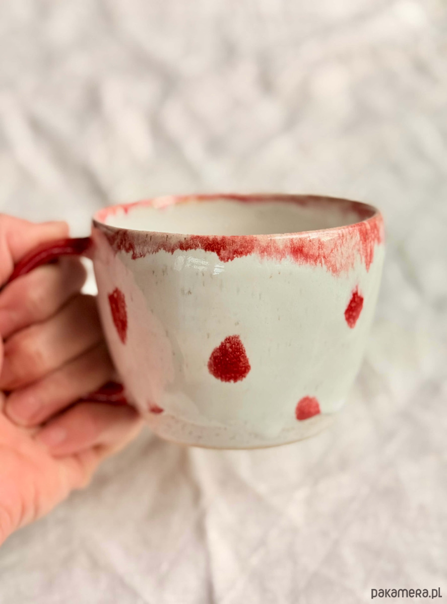 Każda sztuka jest unikatowa, ma niepowtarzalne zdobienie. Efekt rozmytych serduszek ma fajny urok i dodaje naczyniu niepowtarzalnego charakteru. Polecam dokupić talerz do kompletu. Talerz dostępny jest w oddzielnej ofercie.