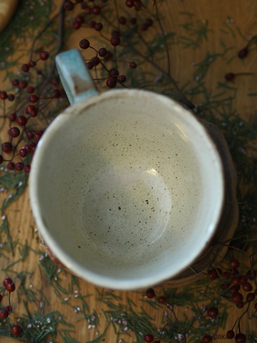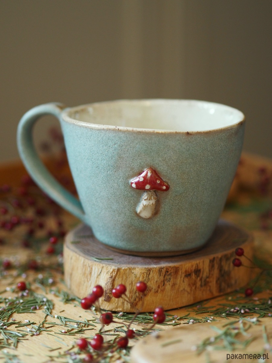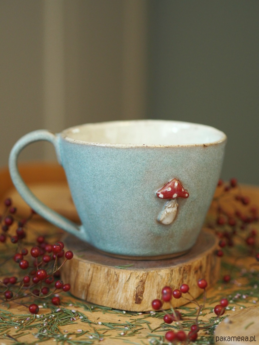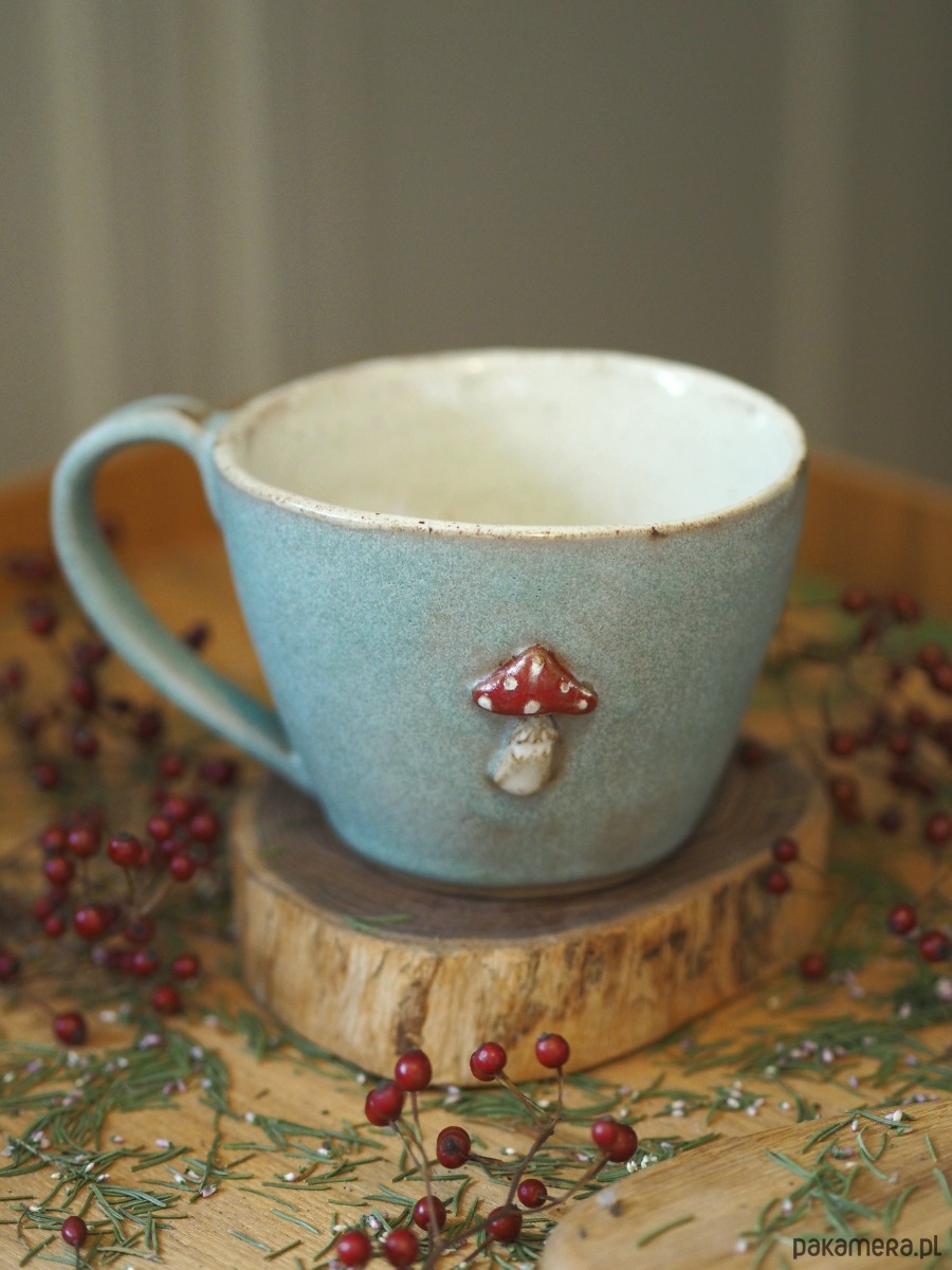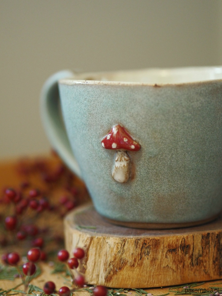 Duży kubek z motywem muchomora. Pojemność 480ml. Można myć w zmywarce. Wypalany w 1240stopniach.