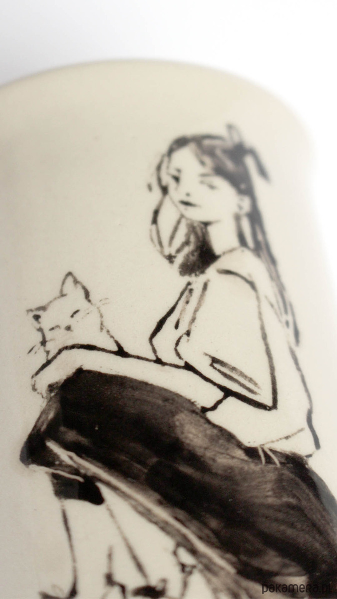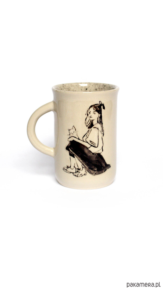 Kubek malowany czarnymi farbami podszkliwnymi, wykonany w małej krakowskiej pracowni ceramicznej. Zastosowano wysokiej jakości kremową gline kamionkową, 100% handmade. Szkliwiony transparentnym błyszczącym szkliwem. Sygnowany. Naczynie można myć w zmywarce.