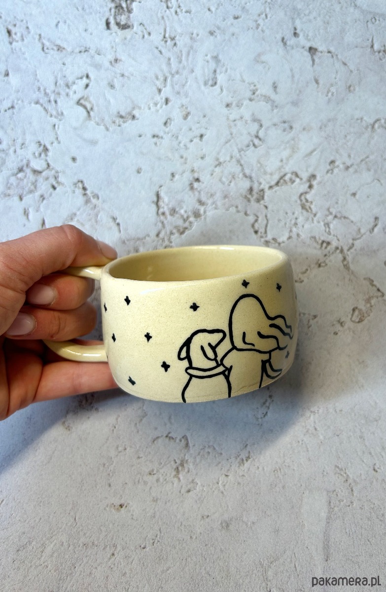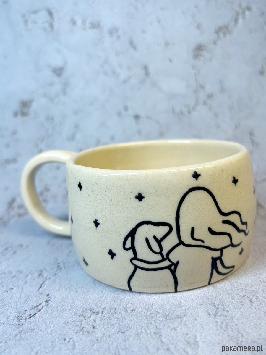 Kubek zdobi minimalistyczna ilustracja dziewczyny z psem wtulonych w siebie pod rozgwieżdżonym niebem.