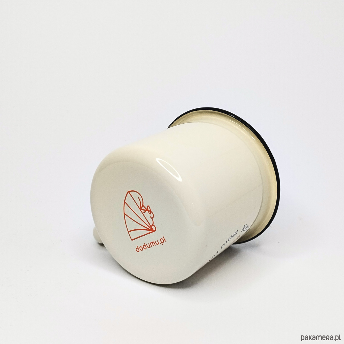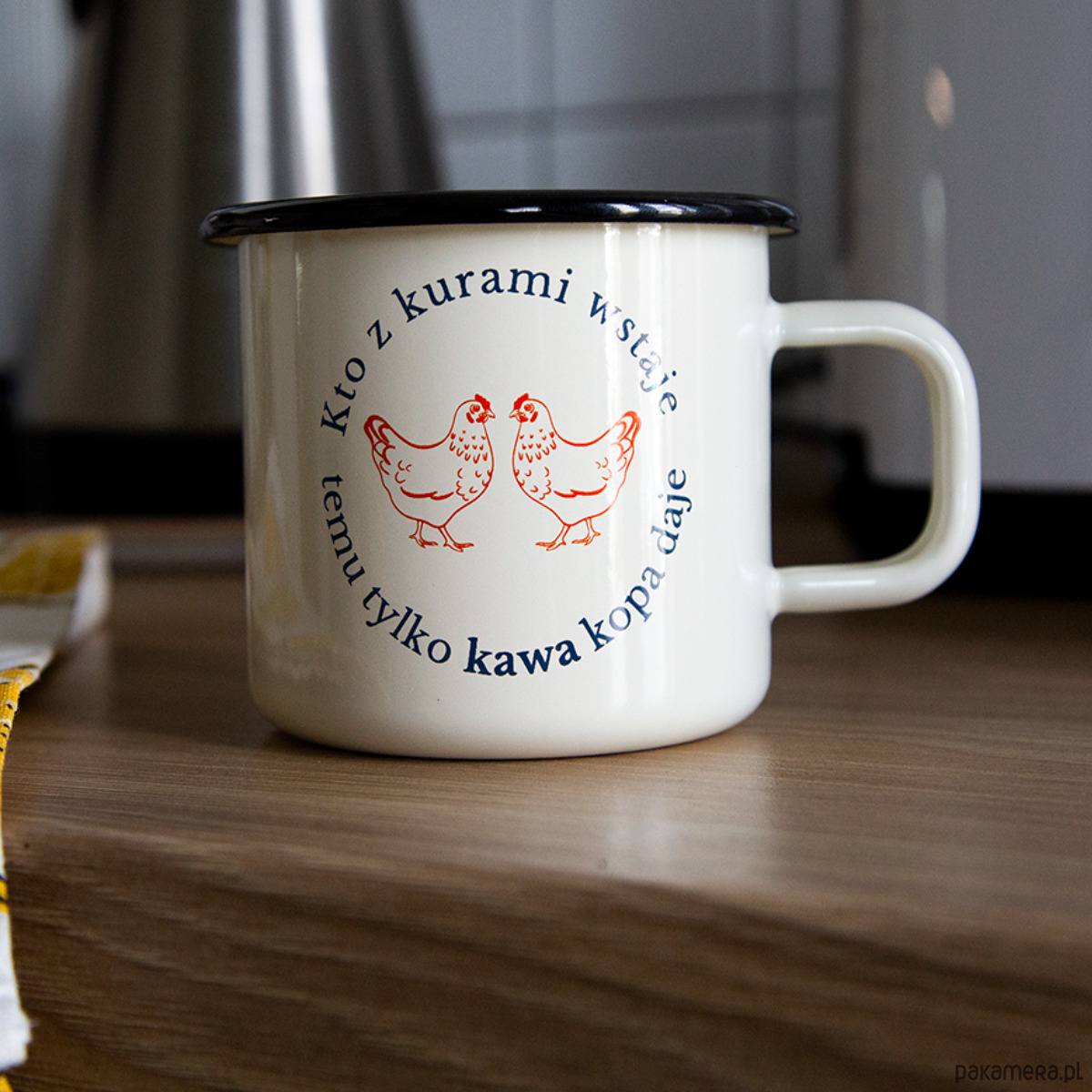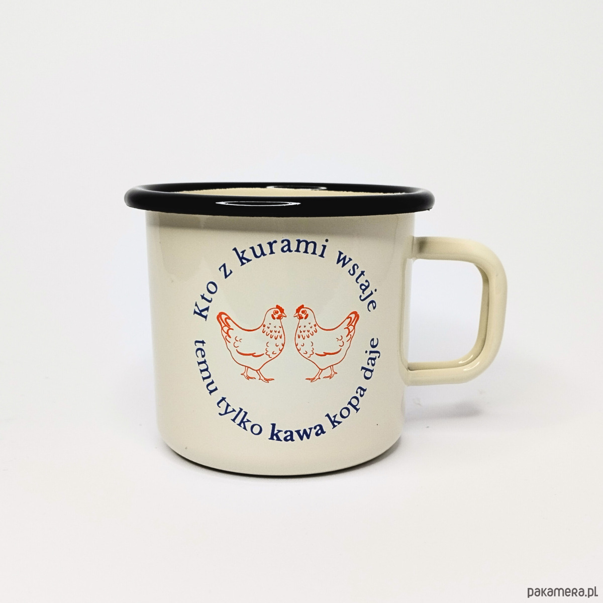 Kubek emaliowany do kawy, jasnokremowy z nadrukiem