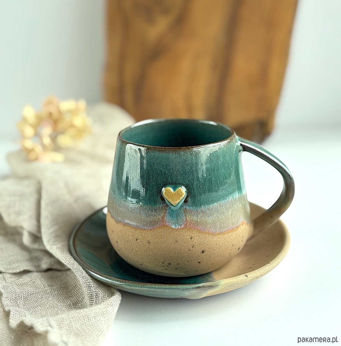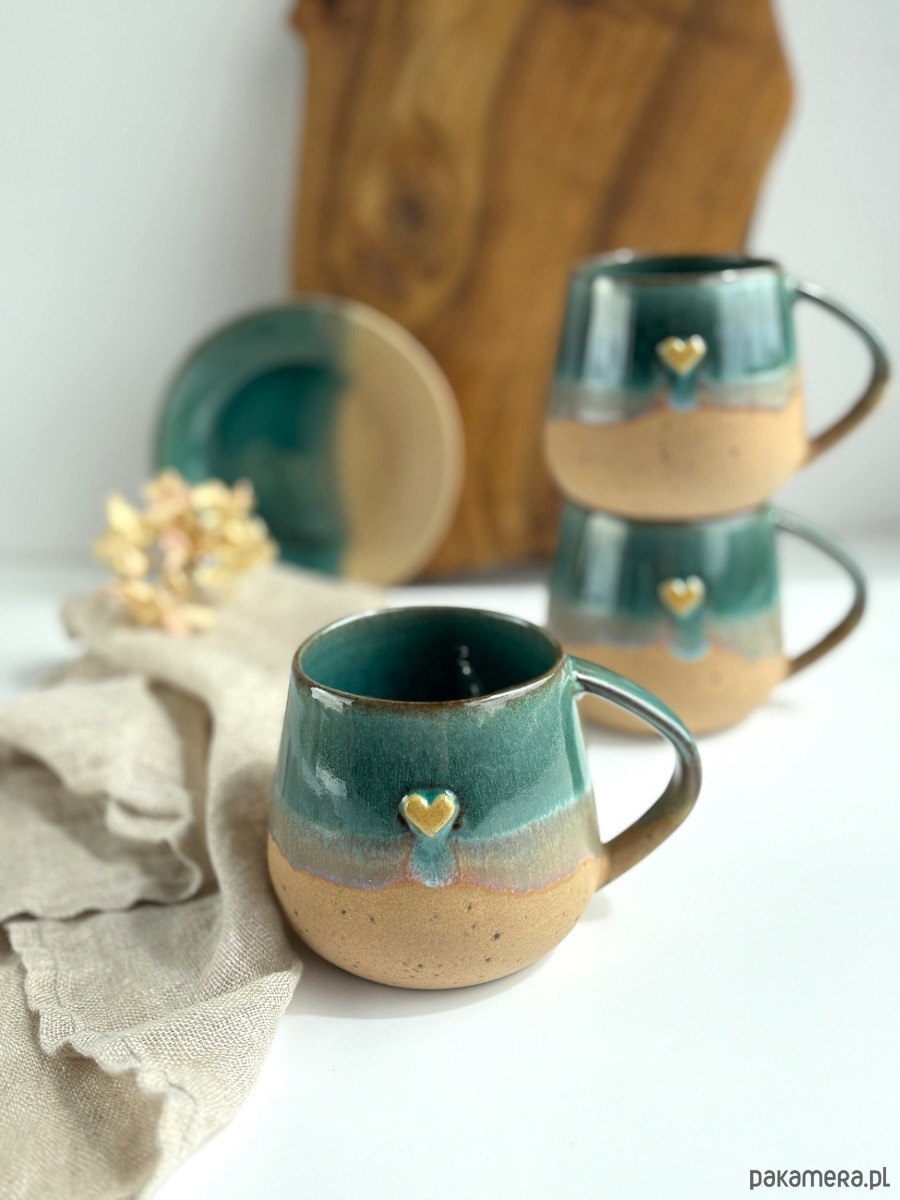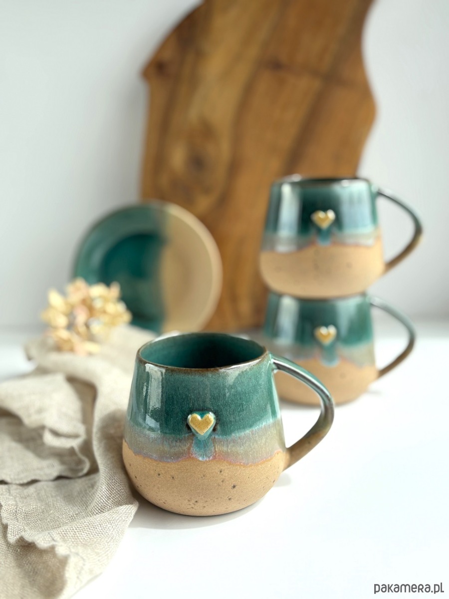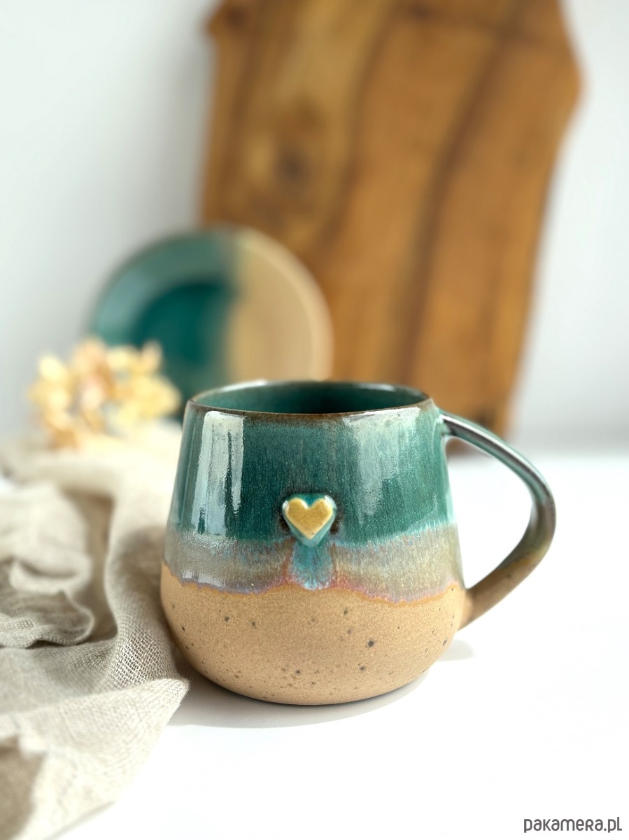 Ręcznie robiony kubek / filiżanka ceramiczna beczułka ze spodeczkiem - Rajska plaża z sercem