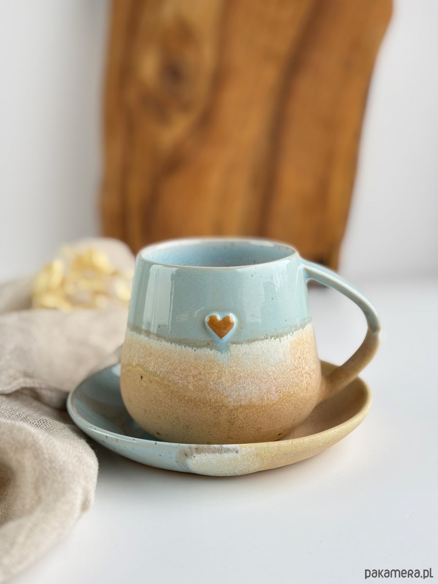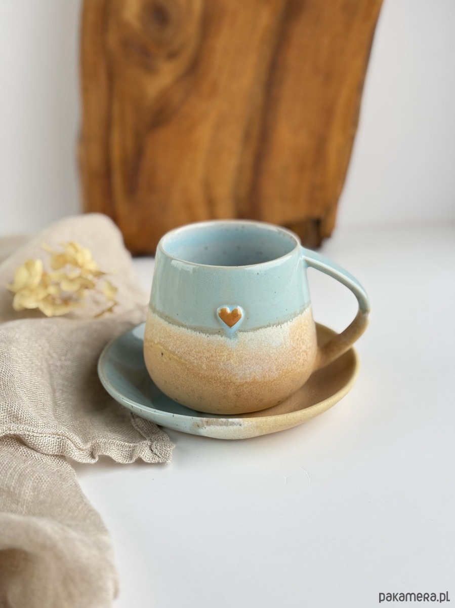 Ręcznie robiony kubek / filiżanka ceramiczna beczułka ze spodeczkiem - Niebieskie migdały z sercem