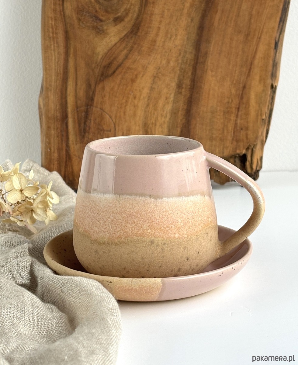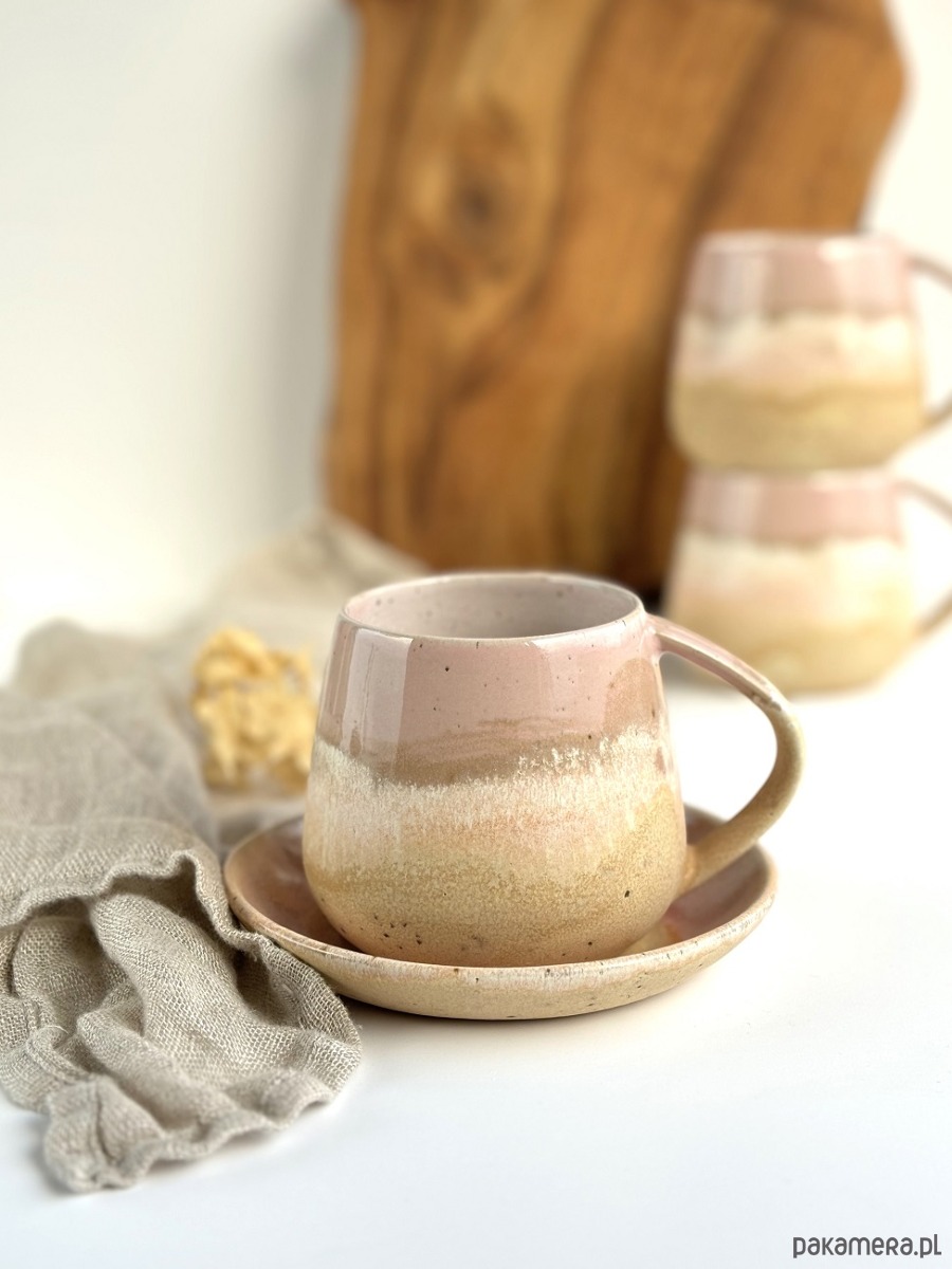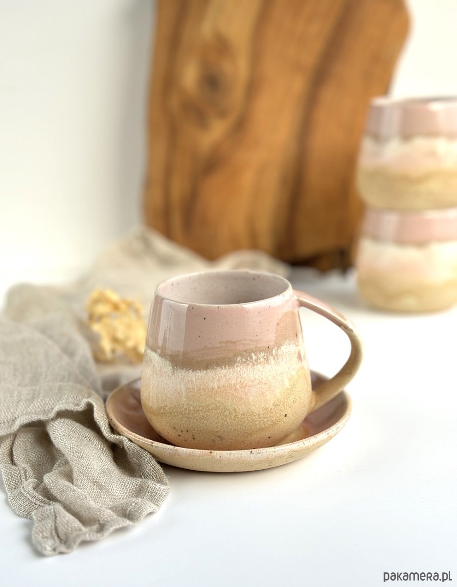Pięknie się przenikające odcienie delikatnego różu oraz odcieni piasku na beżowej masie ceramicznej z centkami.