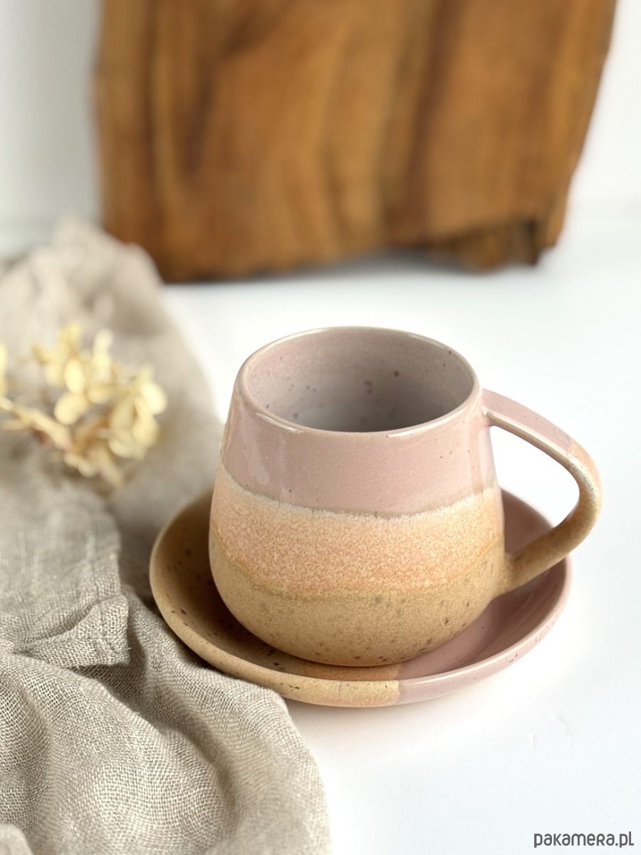Ręcznie robiony kubek / filiżanka ceramiczna beczułka ze spodeczkiem - Różowe migdały z sercem