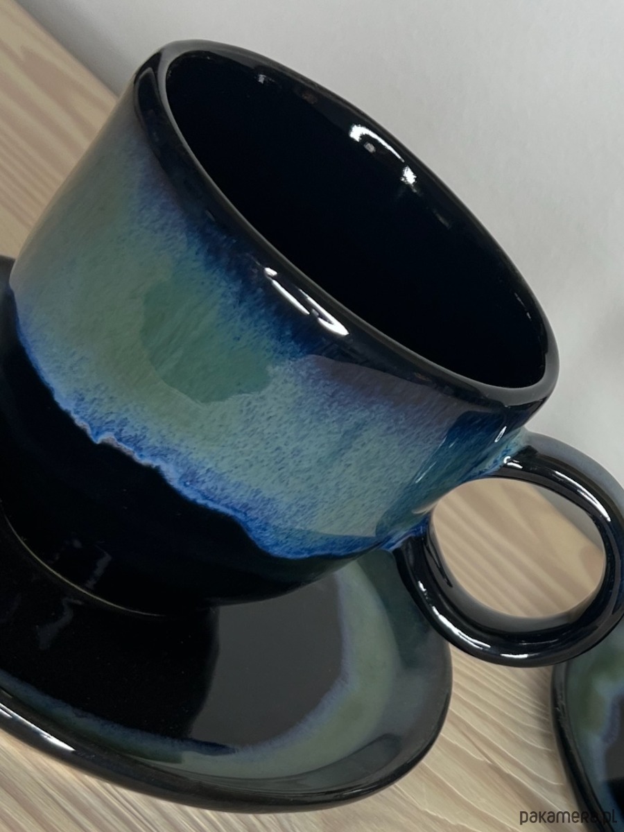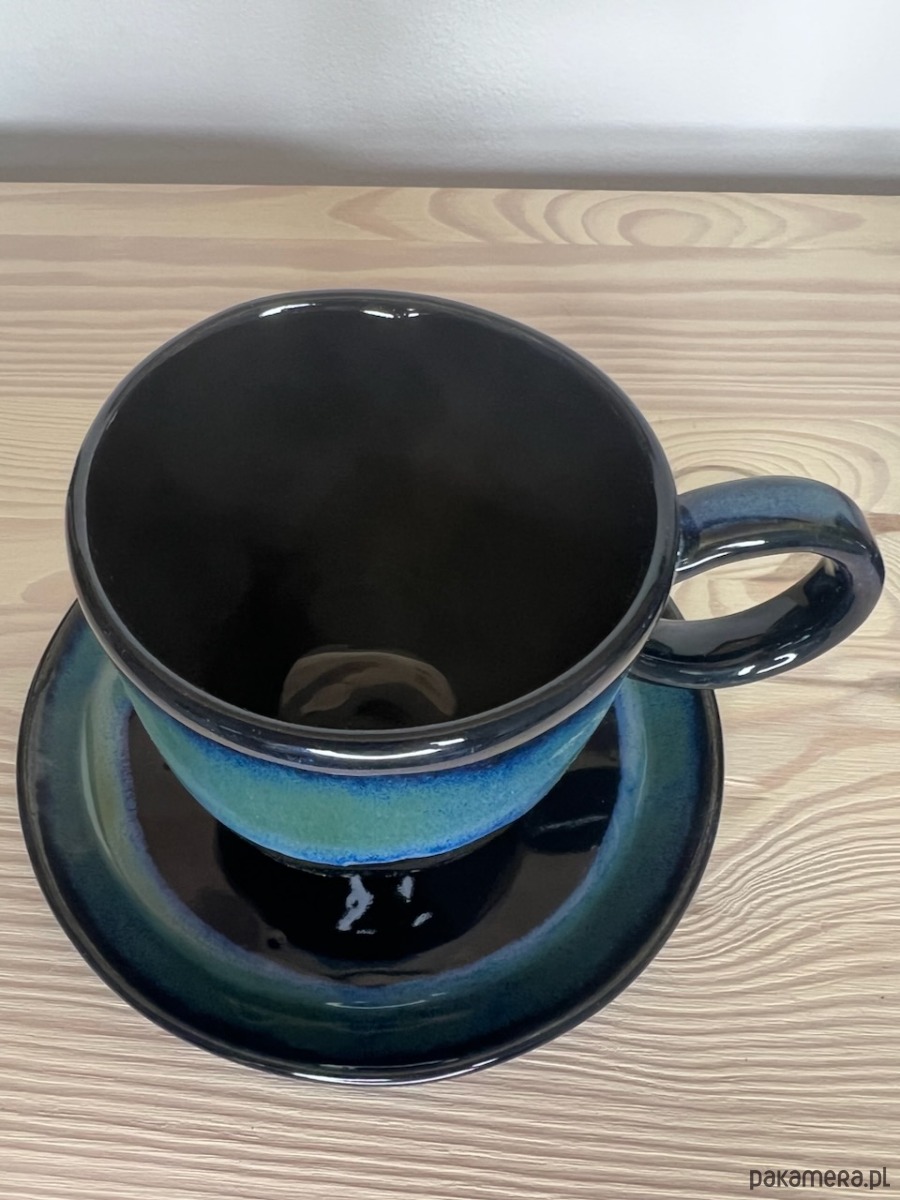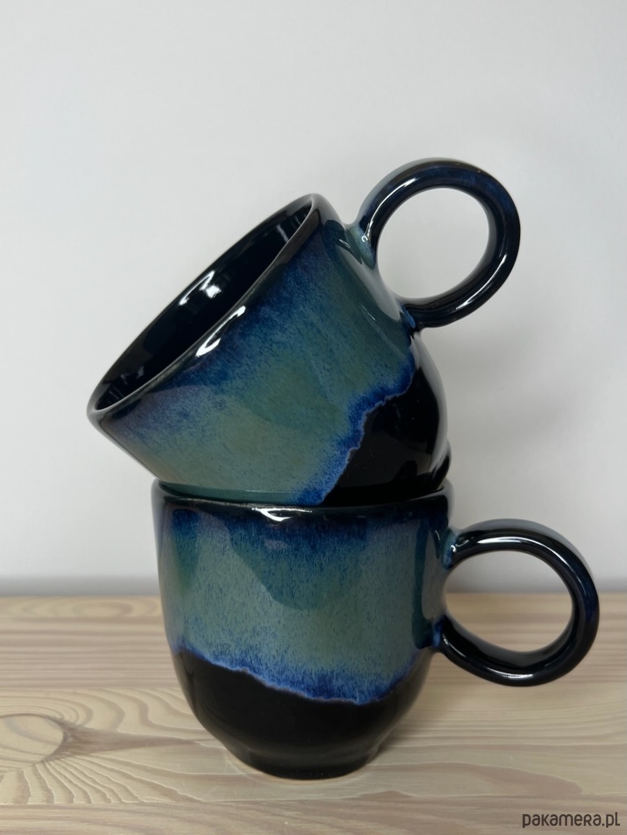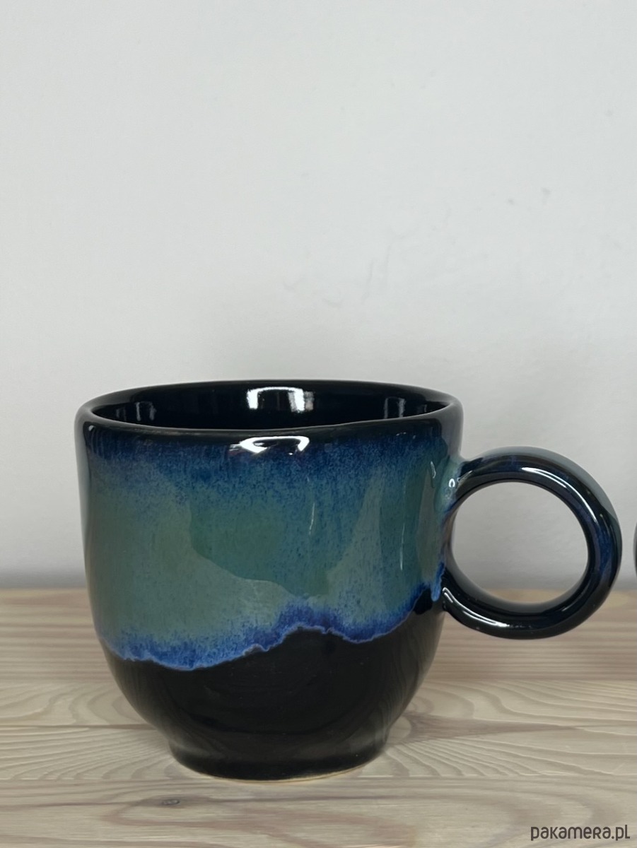 Kubek idealny do kawy mlekiem lub herbaty, pokryty błyszczącym szkliwem - czarna baza z niebiesko zielonymi refleksami.