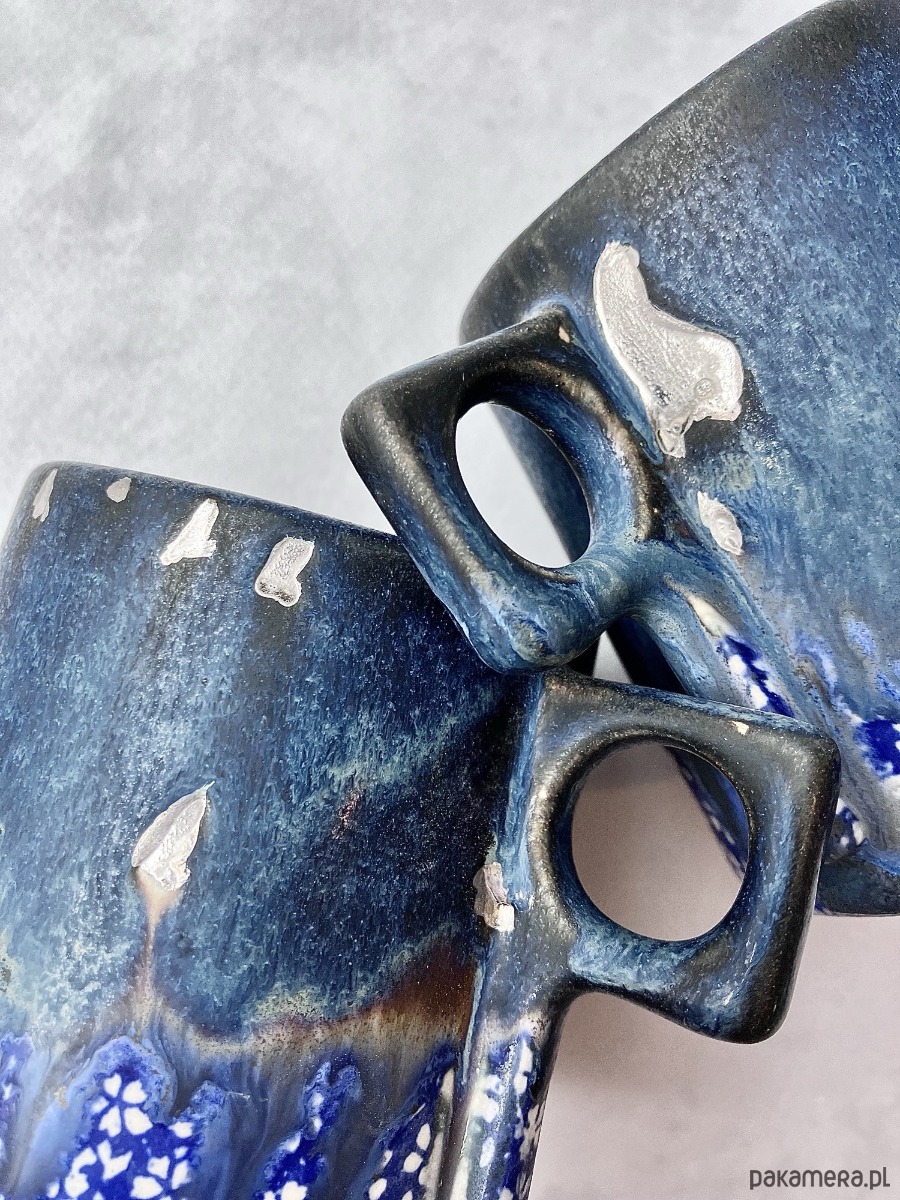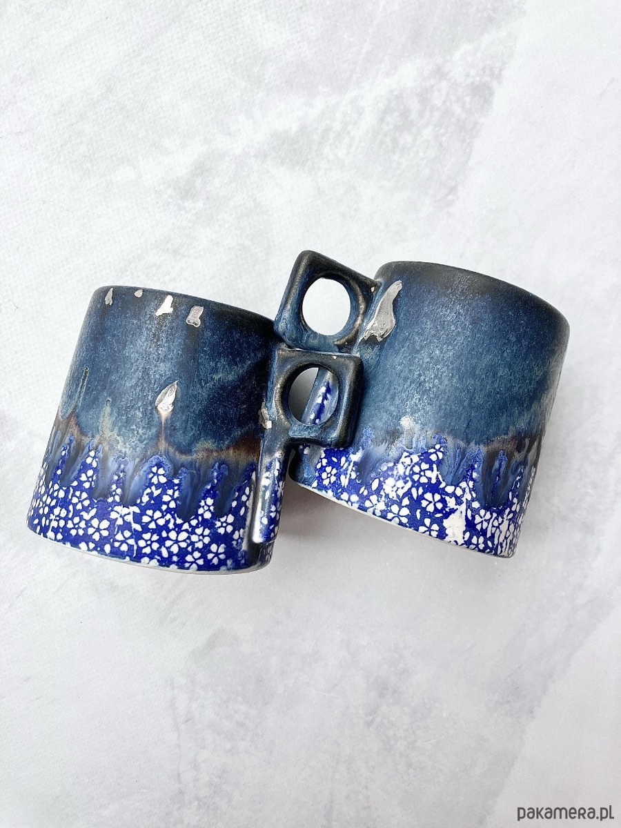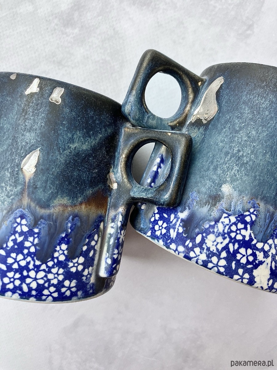 Kubeczek FLOWERS to połączenie artystycznej ceramiki i codziennej funkcjonalności. Inspirowany naturą, zachwyca głębokimi odcieniami granatu i błękitu, które subtelnie przenikają się niczym nocne niebo odbijające się w tafli wody. Uroku dodają srebrzyste nakrapiania. Dolna część zdobiona jest kontrastowym, kwiatowym wzorem w intensywnym kobalcie i bieli, nadając całości lekkości i wyjątkowego charakteru.